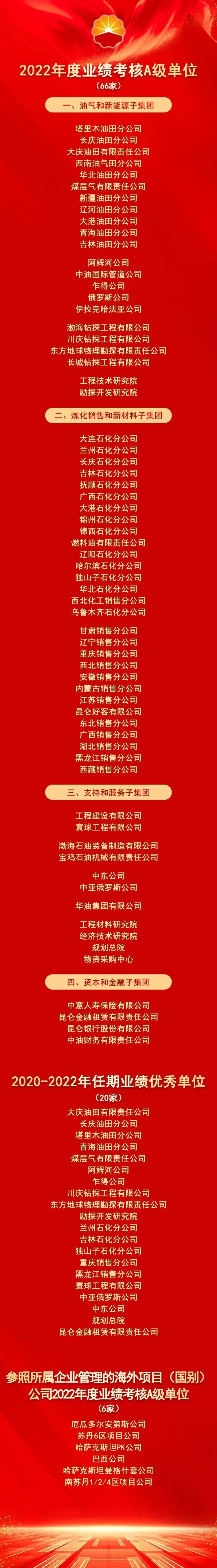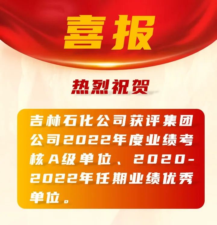 7月26日,从集团公司获悉:吉林石化公司在内的66家企业获得2022年度业绩考核A级单位,这是公司自被评为2016年度业绩考核A级单位以来,连续七年被评为A级。同时,公司还荣获了2020-2022年任期业绩优秀单位。