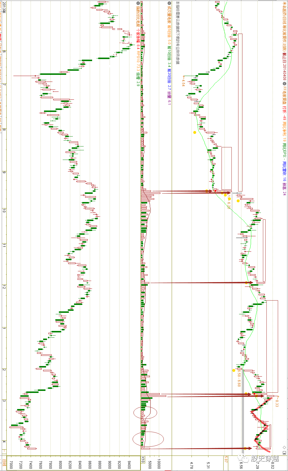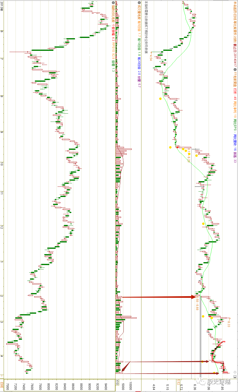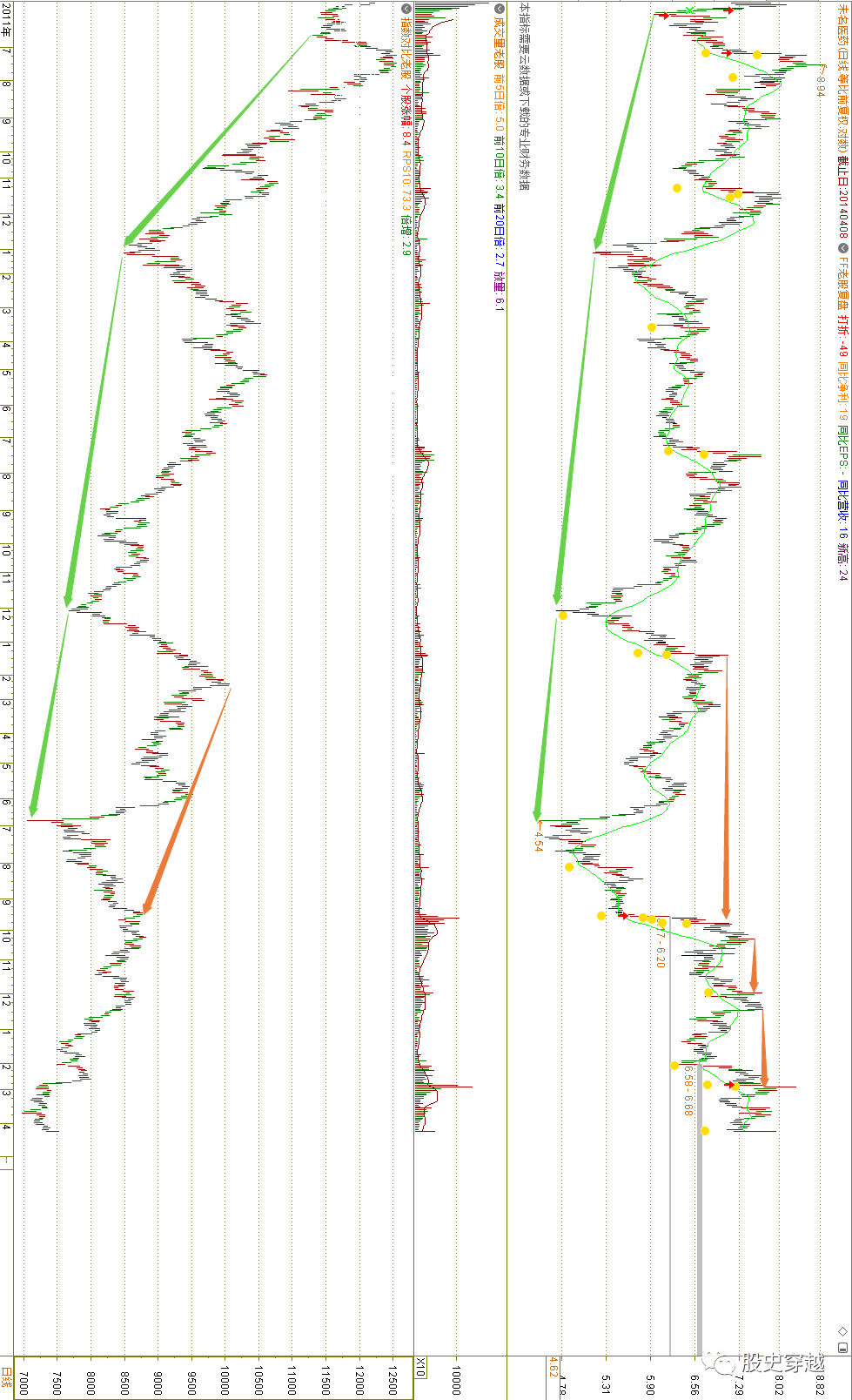 回到我们熟悉的技术分析,上市后WM三个绿箭头可以看出他的随波逐流,但是黄箭头1处他已经领先于指数创了中期新高,黄箭头2和3再次新高,多空3轮对战下来,空头的气势已经灭的差不多了。