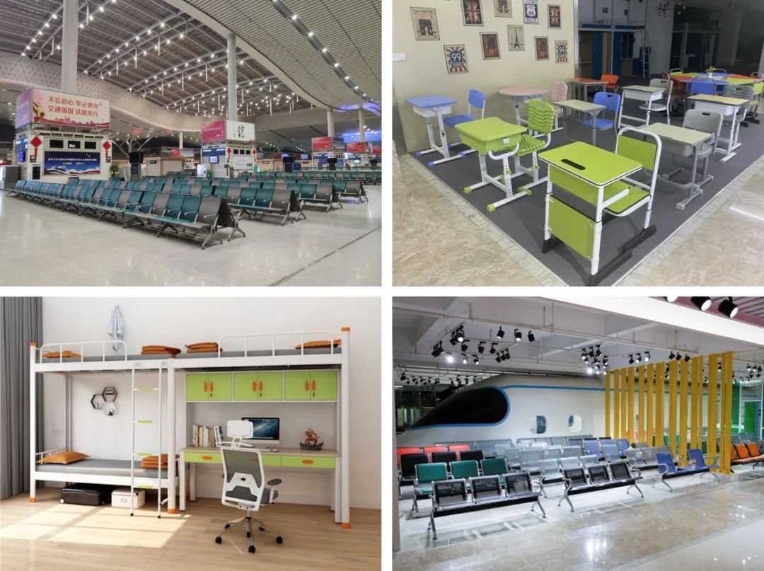 产品包括:机场椅、礼堂椅、学生课桌椅、学生公寓床等各类家具,致力于为机场、高铁站、车站、医院、学校等各事业单位提供公共空间的解决方案,从空间设计,办公家具选择,到施工安装及售后,提供专业服务,使公司赢得了广大客户的赞誉和好评,公司的年生产出货量已经达到100 万张,年产值过亿,是佛山地区生产同类产品规模最大的企业之一。