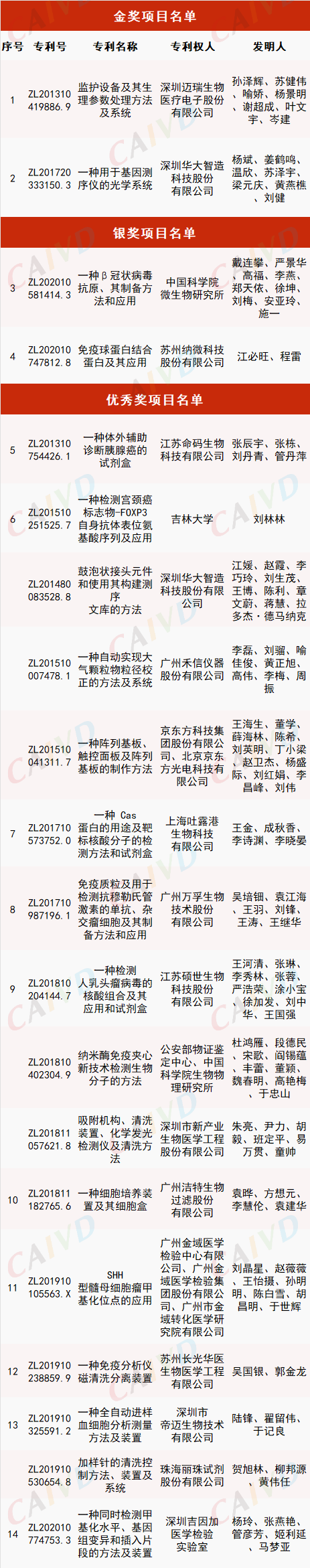 根据《中国专利奖评奖办法》规定,经国务院有关部门知识产权工作管理机构、地方知识产权局、有关全国性行业协会,以及中国科学院院士和中国工程院院士等推荐,中国专利奖评审委员会评审,社会公示,国家知识产权局和世界知识产权组织决定授予29项发明、实用新型专利中国专利金奖,10项外观设计专利中国外观设计金奖;国家知识产权局决定授予60项发明、实用新型专利中国专利银奖,15项外观设计专利中国外观设计银奖;777项发明、实用新型专利中国专利优秀奖,45项外观设计专利中国外观设计优秀奖;7家单位中国专利奖最佳组织奖,20家单位中国专利奖优秀组织奖,20位院士中国专利奖最佳推荐奖。