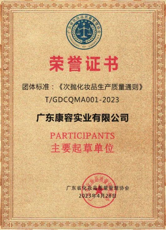 7月26日-28日,2023华南国际美容博览会各路大牌齐聚,精彩纷呈。作为化妆品中高端OEM/ODM的佼佼者,康容实业有限公司在本次展会荣耀登场,多款次抛产品及新品系列尤为吸睛,惹得众人驻足,气氛燃爆全场。大自然孕育着生命,也孕育着神奇的特色成分,他们是山川湖海早已蕴藏许久的一部分。康容将目光聚焦于中国特色成分的应用上,采用全新配方思路,以“中国特色成分+科学配方”打出差异化,建立起中国特色成分化妆品的全球性优势。在今年,康容重磅推出了以“海洋珍珠胶原肽”为核心的2款产品——珍珠胶原肽全效智能调控系列,凝光时珍抗初老系列,靶向精准,多效护肤。更有从贵州珍贵白茶嫩芽中提取的EGCG为抗氧核心的东方茵韵茶醺系列、主打以花抗老,牡丹养颜亮肌的牡丹奢养稚粉焕白系列,让中国特色植物资源焕发出新的生机,也为中国美妆产业升级带来新机遇。伴随消费升级带来的护肤需求细分升级,能针对性地解决肌肤问题并改善皮肤状态的护肤品更容易击中消费者的需求靶心。康容持续深挖细分护肤需求,分肤定制、分龄护肤、关注个性化场景,精准洞悉不同年龄、不同肤质的护肤需求及满足医美项目修护期,换季脆弱,熬夜后等特殊场景的护肤需求。基于全面的市场洞察,康容的产品线丰富且完整,涵盖水、乳、膏、霜、冻干粉等全品类。近年来,次抛化妆品凭借着无菌安全、锁鲜高效、便携易带等优点,受到消费者的青睐,一跃成为热门细分品类。康容在2018年的时候率先引入两条医用级别的BFS次抛生产线,成为业内首个引入BFS次抛生产线的化妆品企业。多年来,康容不断钻研次抛,锤炼“内功”,成为第一家做化妆品B.F.S次抛剂型学术论文的企业;第一家联手跨国企业进行B.F.S次抛ISCC PLUS认证的企业;第一家牵头发布《次抛化妆品生产质量通则》团体标准的企业。从学术研究、环保认证、生产质量三大层面赋能次抛价值再升维,让高活性、低防腐的BFS次抛精华更绿色,更靶向,更鲜活。上图为康容《次抛化妆品生产质量通则》团体标准主要起草单位认证证书