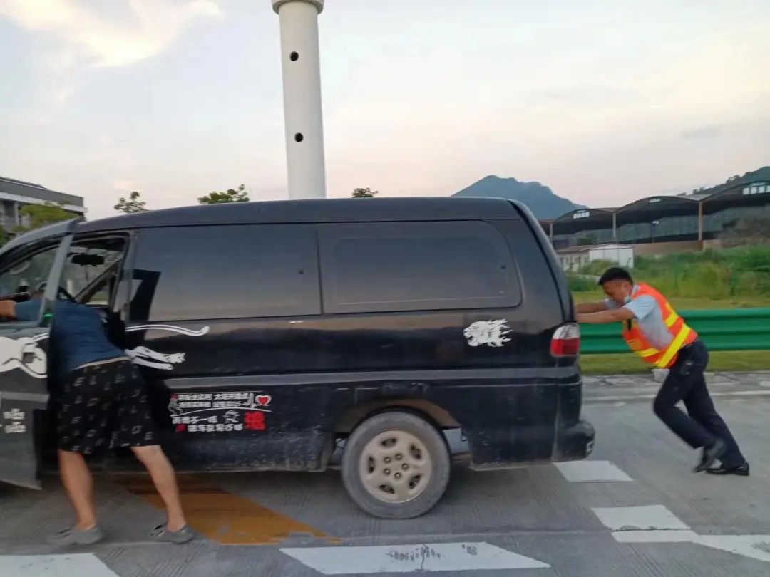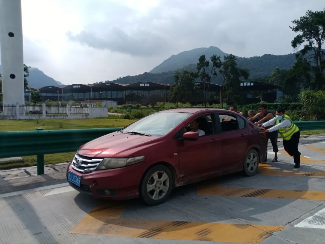 与司机一起将车辆推至收费广场安全地带