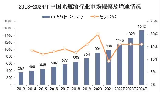 光瓶市场的持续火热,可追溯至2013年,其市场规模也由彼时的352亿元,迅速增长至2021年的988亿元,年均复合增速高达13.8%,预计2022年至2024年,还将保持16%的年增长速度,到2024年市场规模将超过1500亿元。