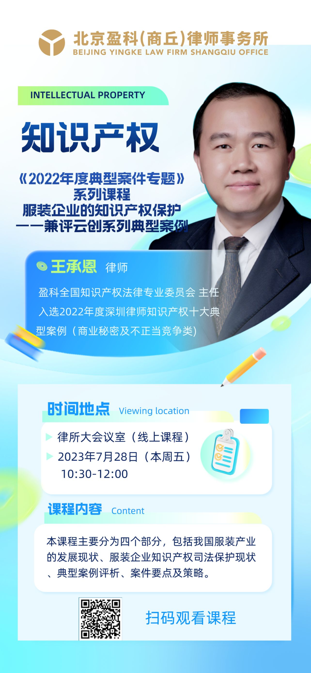 为了加强所内律师对知识产权保护方面的学习,提高所内律师的职业素质和执业水平。北京盈科(商丘)律师事务所将于7月28日(本周五),上午10:30在盈科商丘大会议室统一观看知识产权系列课程(线上课程),《服装企业的知识产权保护——兼评云创系列典型案例》。
