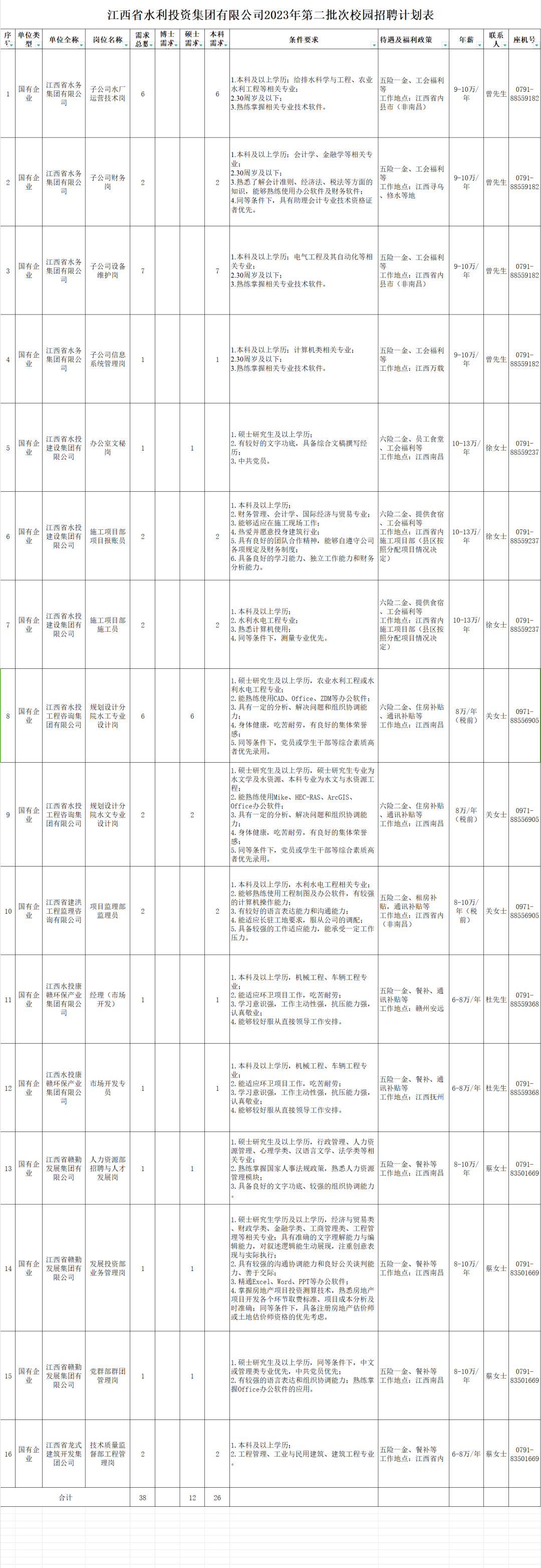 本批次招聘计划为16个岗位,共38人。其中硕士研究生及以上学历12人,本科及以上学历26人。具体岗位需求人数详见附件《江西省水利投资集团有限公司2023年第二批次校园招聘计划表》。