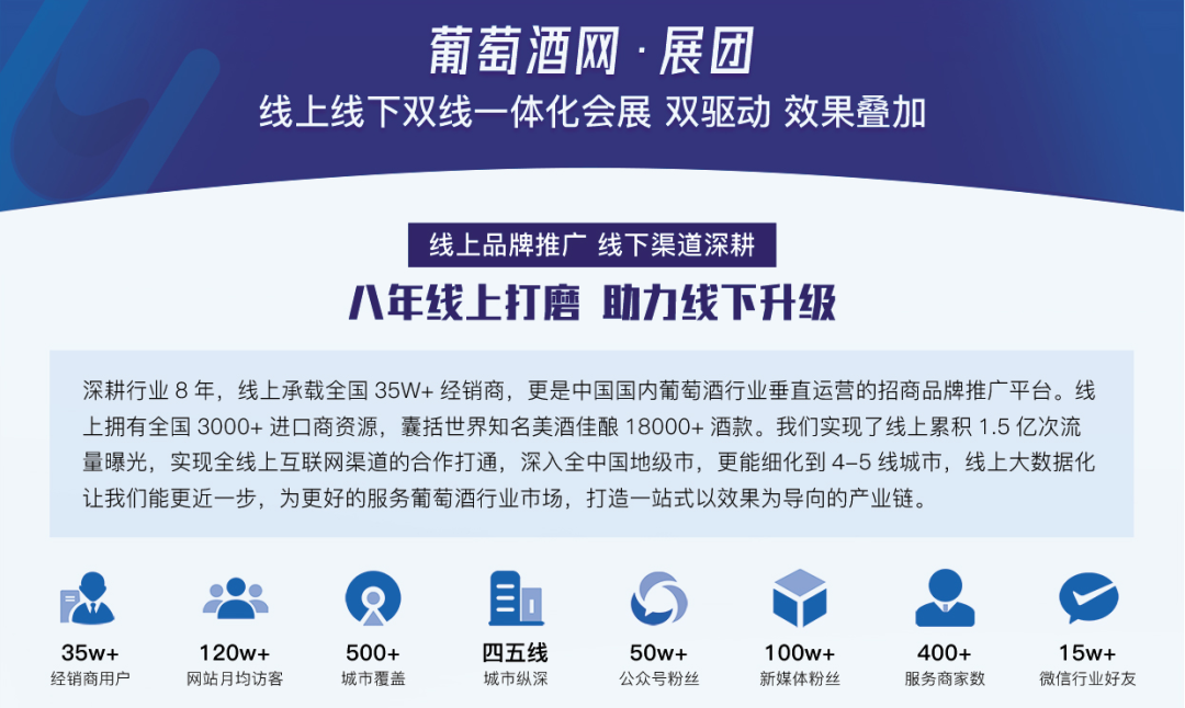 线上线下联合打通的“双会展”模式或成当下最佳发展趋势。我们发挥葡萄酒网线上大数据资源的优势,极致打造最低成本的双会展模式。