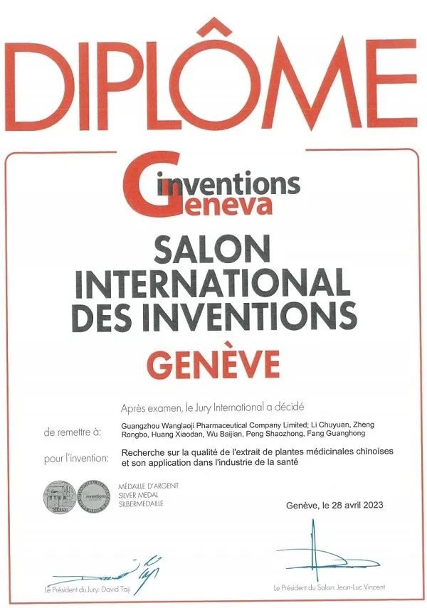 近日,在瑞士举办的2023年第48届日内瓦国际发明展评审结果公布,广州王老吉药业股份有限公司的参展项目“中草药提取的质量研究及其在健康产业的应用”(Research on the Quality of the Extractive Chinese Herbal Medicine and Its Application in the Health Industry)在全球众多创新项目中脱颖而出,荣获日内瓦国际发明展银奖!日内瓦国际发明展由瑞士联邦政府、日内瓦市和世界知识产权组织共同举办,是全球举办历史最长、规模最大的发明展之一,与匹兹堡发明展、纽伦堡发明展一起被称为世界三大发明展。本届展会共有40个国家的800多个参展单位共展出1000多个发明项目。日内瓦发明展设置了多个奖项,旨在激发发明创造活力,促进国际合作。作为世界500强广药集团下属企业王老吉药业在科技创新方面实力雄厚,2008年以来连续5次认定为高新技术企业;2019年通过国家知识产权管理体系贯标认证,2022年完成再认证;2022年被认定为“国家知识产权示范企业”;拥有中国轻工业植物饮料重点实验室、广东省名优中成药与凉茶企业重点实验室;广东省省级企业技术中心、广东省凉茶(王老吉)工程研究中心;及广州市博士后创新实践基地等多个市级研发平台。2023年围绕集团“双效提升”发展主题,王老吉药业加大科技创新力度,以为知识产权为抓手,迈出国际化新台阶。在研究所核心团队的共同努力下,积极开展日内瓦国际发明展申报。 最终,广州王老吉药业股份有限公司以凉茶为代表的中草药提取的质量研究及其在健康产业的应用,在众多项目竞选中,取得较好成绩,获得银奖。凉茶是一种草本植物饮料,国家级非物质文化遗产之一。作为“凉茶始祖”的王老吉凉茶,其主要成分由仙草、鸡蛋花、布渣叶、菊花、金银花、夏枯草和甘草的中药提取物组成。本项目通过创新研究和应用发现,王老吉凉茶能够明显延长秀丽线虫的寿命,提升吞咽能力和运动能力、显著降低线虫Poly-Q和Aβ 1-42 诱导的神经毒性,因而具有改善生理功能、抗应激、防治神经退行性疾病、及延长寿命等作用。王老吉凉茶在制备及质量控制方面追求创新,应用高速溶膏技术生产,并成功分离鉴定出专属化学成分,突破了凉茶风味物质、指纹图谱等质量控制技术。本项研究已获得十余项中国发明专利授权,荣获中国专利奖优秀奖3项,并推动了凉茶饮料(SCM 0027-2019)国际标准的制定发布,对开展中国凉茶的国际推广和提升以凉茶为代表的中医药文化国际交流具有重要价值,激发发明创造活力,促进国际合作。随着时代的进步,人们对健康饮食的诉求也越来越迫切,王老吉凉茶在保持原方的基础上,产品生产技术上持续创新,产品不断升级以满足市场需求。以科技赋能产品,助力企业高质量发展。相信通过更深层次的科学研究,以及不断传承创新,可以让中国的王老吉凉茶文化走出中国,走向全球,赢得世界认同,守护世人健康。
