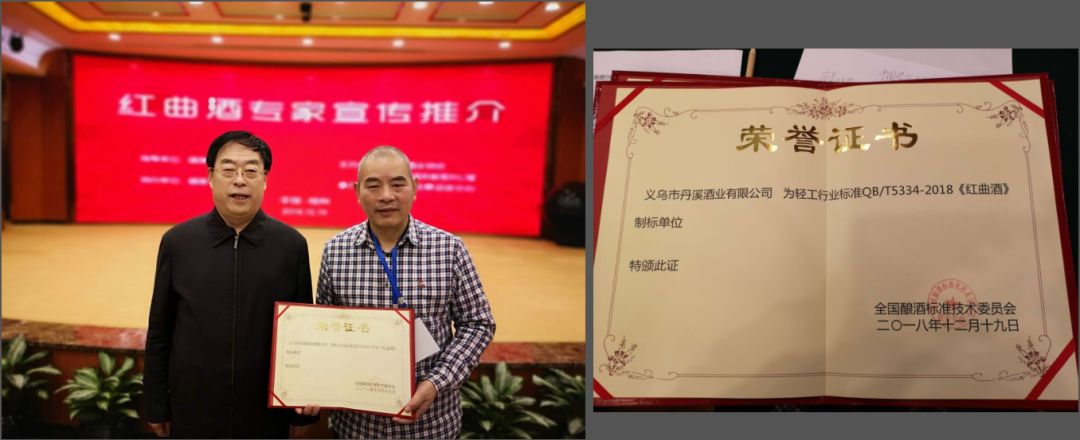 2018年12月19日,中国酒业协会副理事长刘秀华为义乌市丹溪酒业有限公司颁发红曲酒标准制标单位证书,丹溪红曲酒成为红曲酒酿造行业标准制定者。