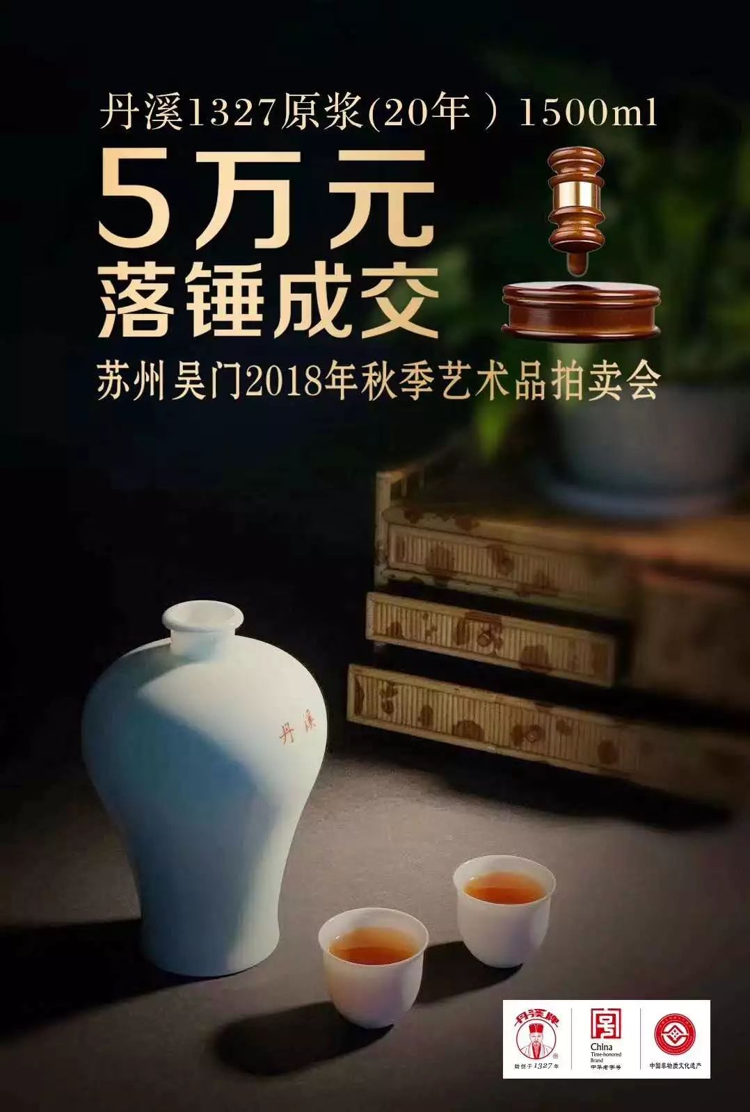合作吴门拍卖:本次拍卖会,丹溪酒业的拍品为“丹溪1327原浆(20年)1500ml”,酒龄20年,酒瓶采用瓷都景德镇颜玉窑7501瓷(原毛主席专用瓷)、全手工拉胚制成,底部配有翠竹红梅画面。起拍价6000元人民币,在经过二十多轮的叫价后,最终以5万元人民币的高价成交,加上佣金合计6万,相当于两万元一斤酒,这在中国黄酒拍卖史实属罕见。