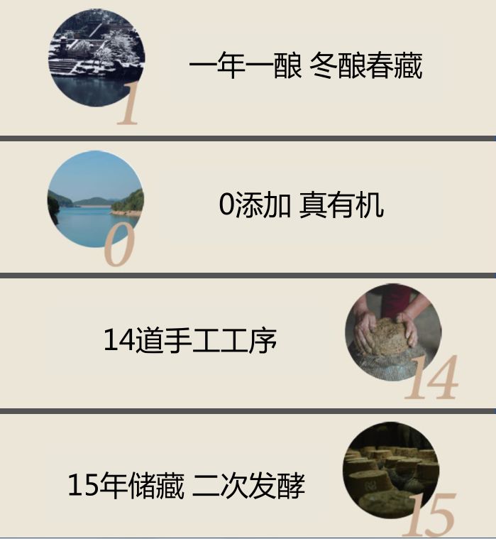 丹溪红曲酒,一年只酿一次酒,每年11月份,取冬水酿造,全程14道手工工序,纯手工,零添加,历时三个月方可酿造完成,此后需窖藏至少5年以上,丹溪1327系列更是需要窖藏15年以上,原酒在坛内二次发酵。
