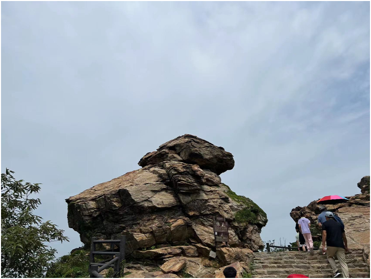 大家从龙气氤氲的九龙桥出发,“穿林打叶”声里“吟啸徐行”,身边是“山头斜照却相迎”的美景,拾阶而上,努力攀登,是一步一个脚印地行稳致远。山高路远,行稳必达,天空海阔,扬帆必至。无限风光就在江苏省最高峰玉女峰,这里峭壁悬崖,巍峨壮观。花果山飞来石,兀立山顶,形如飞过,久立观之,令人遐想。登群山之巅,更觉长风浩荡。