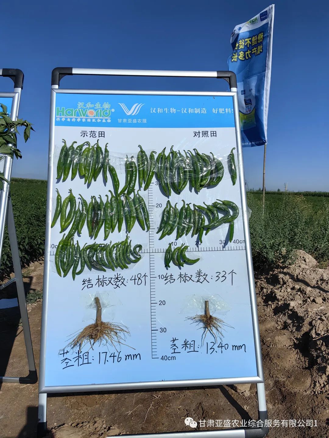 在公司辣椒试验田,试验区无论是作物长势还是结果率都明显优于传统施肥的对照田,辣椒根系发达、秧苗健壮、叶片厚绿、节间短、挂椒集中整齐均匀且结椒率高,辣椒颜色黑绿且肉质厚,平均每株结椒率比对照田高10%。