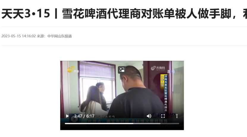 近日,山东电视台齐鲁频道《小溪办事》节目官号在抖音平台发布了一段视频,画面中,自称为雪花啤酒前代理商的杨先生表示,被雪花啤酒的经理套取相关费用的问题,一直没有得到解决。