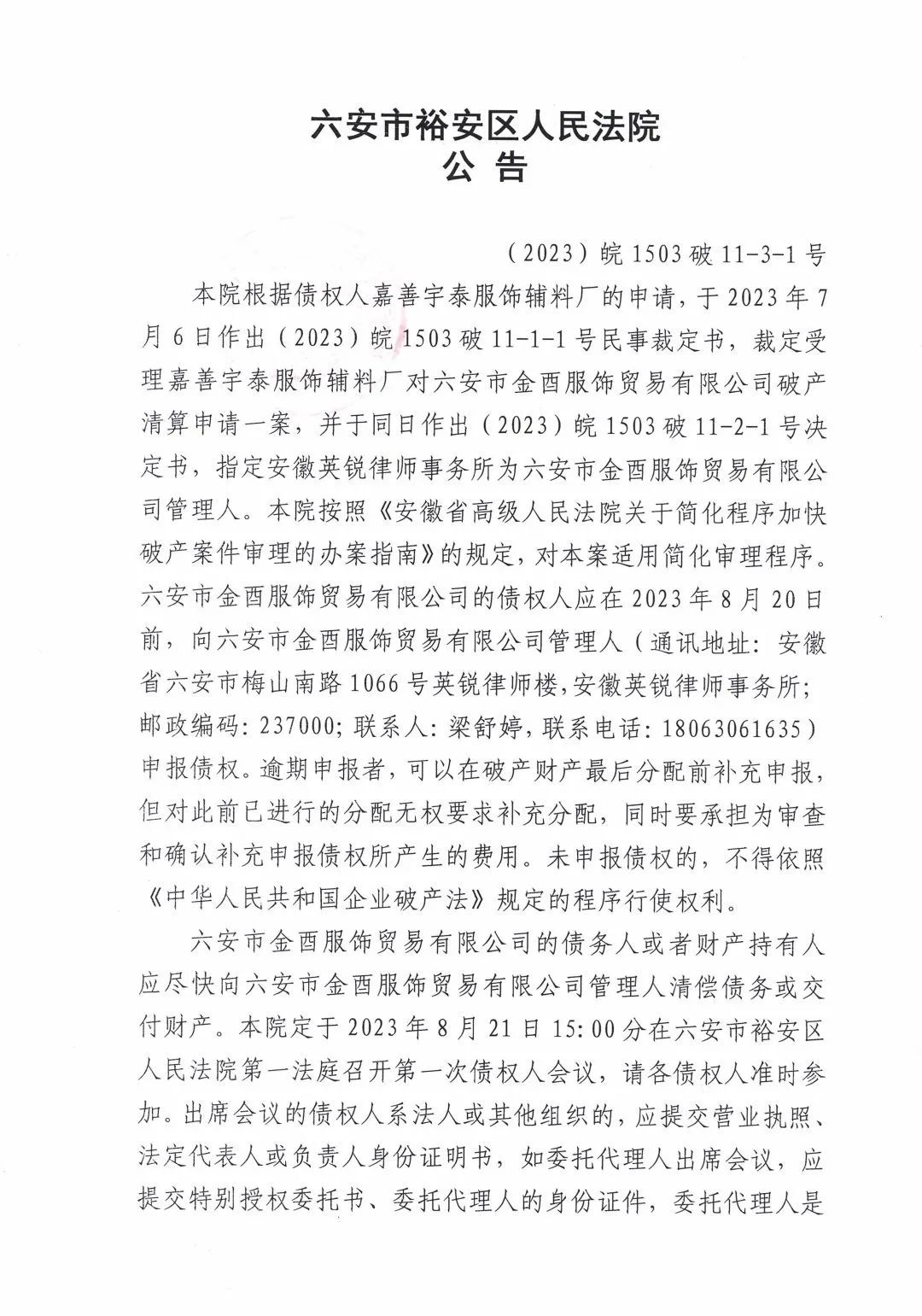本院根据债权人嘉善宇泰服饰辅料厂的申请,于2023年7月6日作出(2023)皖1503破11-1-1号民事裁定书,裁定受理嘉善宇泰服饰辅料厂对六安市金酉服饰贸易有限公司破产清算申请一案,并于同日作出(2023)皖1503破11-2-1号决定书,指定安徽英锐律师事务所为六安市金酉服饰贸易有限公司管理人。本院按照《安徽省高级人民法院关于简化程序加快破产案件审理的办案指南》的规定,对本案适用简化审理程序。六安市金酉服饰贸易有限公司的债权人应在2023年8月20日前,向六安市金酉服饰贸易有限公司管理人(通讯地址:安徽省六安市梅山南路1066号英锐律师楼,安徽英锐律师事务所;邮政编码:237000;联系人:梁舒婷,联系电话:18063061635)申报债权。逾期申报者,可以在破产财产最后分配前补充申报,但对此前已进行的分配无权要求补充分配,同时要承担为审查和确认补充申报债权所产生的费用。未申报债权的,不得依照《中华人民共和国企业破产法》规定的程序行使权利。