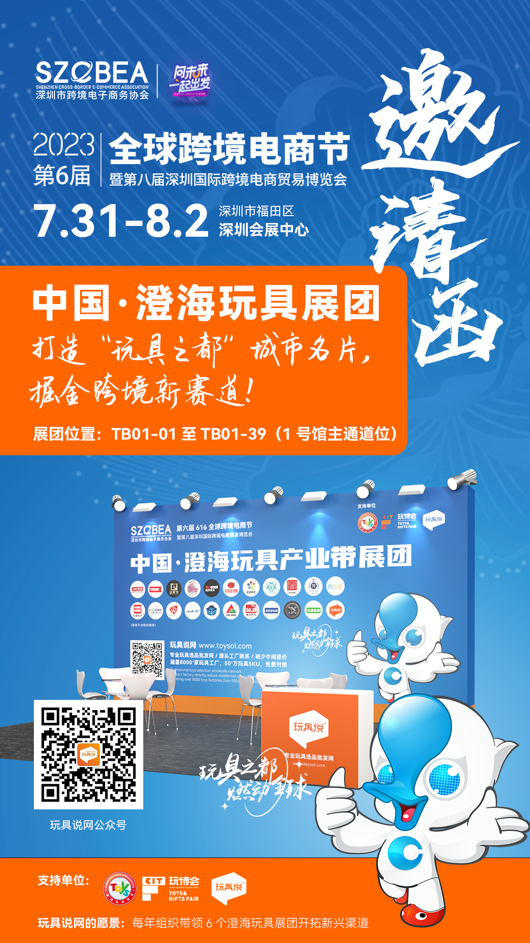 澄海玩具协会作为2023全球跨境电商节支持单位,委派玩具说组建中国澄海玩具产业带展团,打造“玩具之都”城市名片,掘金跨境新赛道。玩具说是一家玩具产业链服务商,我们的愿景是每年组织带领6个澄海玩具展团开拓新兴渠道。