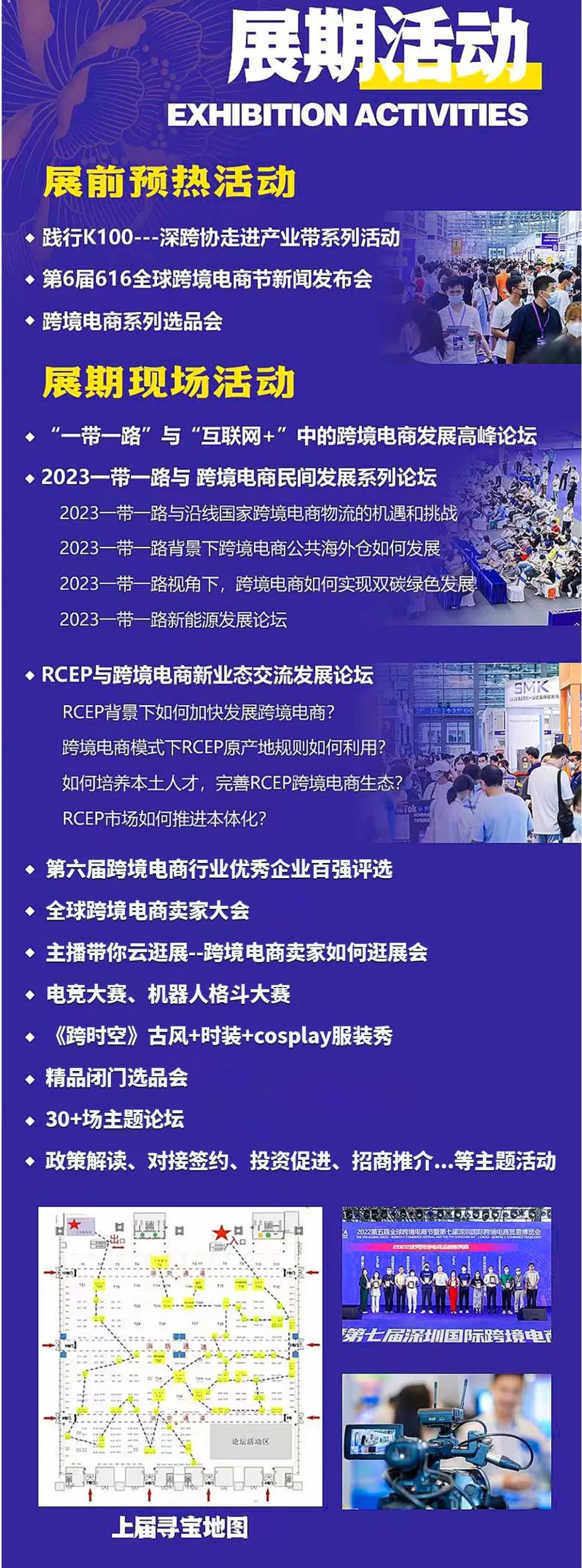 7月31日—8月2日,2023第六届全球跨境电商节暨第八届深圳国际跨境电商贸易博览会将于深圳(福田)会展中心盛大开幕。展会以“文化跨境、品牌出海、智量强国”为主题,围绕“国际化、专业化、产业化、品牌化”目标,组织实施展示、赛事、论坛、商务、活动等五大板块20余项内容。展出面积逾30000㎡,吸引了国内外参展商5000余家,同时将邀请政府主管部门、行业组织、相关企事业单位专家和来自全国范围内近10万专业卖家前来参观和洽谈。作为展会主办方,深圳市跨境电子商务协会为了进一步扩大展会影响力,提升展商的参展价值,本届展会利用媒体聚焦推广展会品牌。借助媒体广告传播效果快、覆盖范围广、亮相频率高、宣传受众精准等优势,进一步让展会深入人心。2023第六届616全球跨境电商节暨第八届深圳国际跨境电商贸易博览会由深圳市跨境电子商务协会(以下简称“深跨协”)主办,深圳市三青鸟国际会展有限公司承办。今年以“文化跨境、品牌出海、智量强国”为主题,展会规模近3万平方米,围绕“国际化、专业化、产业化、品牌化”目标,组织实施展示、赛事、论坛、商务、活动等五大板块20余项内容,重点呈现五个方面的特色亮点,展会规模近3万平方米,汇聚全球海内外超5000+跨境电商参展商。全球跨境电商节以品牌文化结合东方元素展示,融合各地产业带资源,集合各地知名、新锐品牌。常熟服装汽配产业带、中山灯饰产业带、浙江嘉兴服装产业带、河北宠物食品产业带、福建石狮服装产业带、慈溪小家电产业带、宁夏盐池产业带、粤东玩具产业带、义乌小商品产业带、汕头针织服装产业带、宁波产业带、江苏眼镜家纺产业带、阳江刀具产业带、安吉绿色家居产业带、山东威海渔具产业带等50+产业带、2000+优质源头工厂100000+专业买家团齐聚会展中心。自办展以来,深跨协累计办展3个城市、8场展会,面积超16万㎡,服务超4000+展商,参展全球30+国家及地区,累计吸引30万+专业观众。经过长期数据累计并依托自身资源优势,深跨协形成了有序且专业的跨境电商数据库。吸引了跨境电商平台卖家、跨境电商平台自采、跨境电商综合试验区、品牌商及代理分销、传统B2B进出口贸易商、境外采购商国内代理、线下实体店零售商、跨境电商供应链服务商、行业商协会、行业媒体等专业人员。2023年跨境电商进入全新的发展阶段,第六届全球跨境电商节必将打造一场全链路、全产业、全阶层的行业现象级盛会。作为全球跨境电商行业盛会,大会将邀请到引领行业发展作用的最顶尖专家、学者和企业家朋友出席并做报告。行业主题论坛也将充分发挥方向战略引领、资源交流链接的重要作用,共同推动跨境电商行业高质量发展。本届电商节将以"全链条一站式"的独有优势,从不同维度、不同产业、不同视角讲好中国故事,进一步提升跨境产业高度,搭建中国产业互联互通的桥梁。最后,诚挚邀请各位优秀的跨境电商行业企业、代表积极参展,热烈欢迎社会各界朋友在7.31-8.2莅临2023全球跨境电商节暨第八届深圳国际跨境电商贸易博览会,共襄盛会、共谋发展、共创未来。