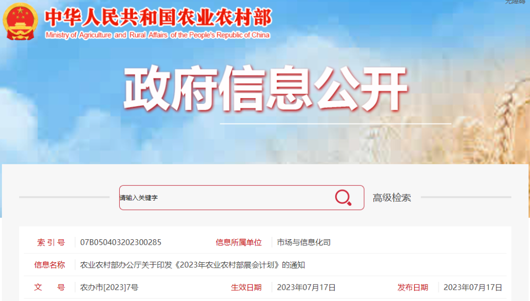 农业农村部办公厅关于印发《2023年农业农村部展会计划》的通知