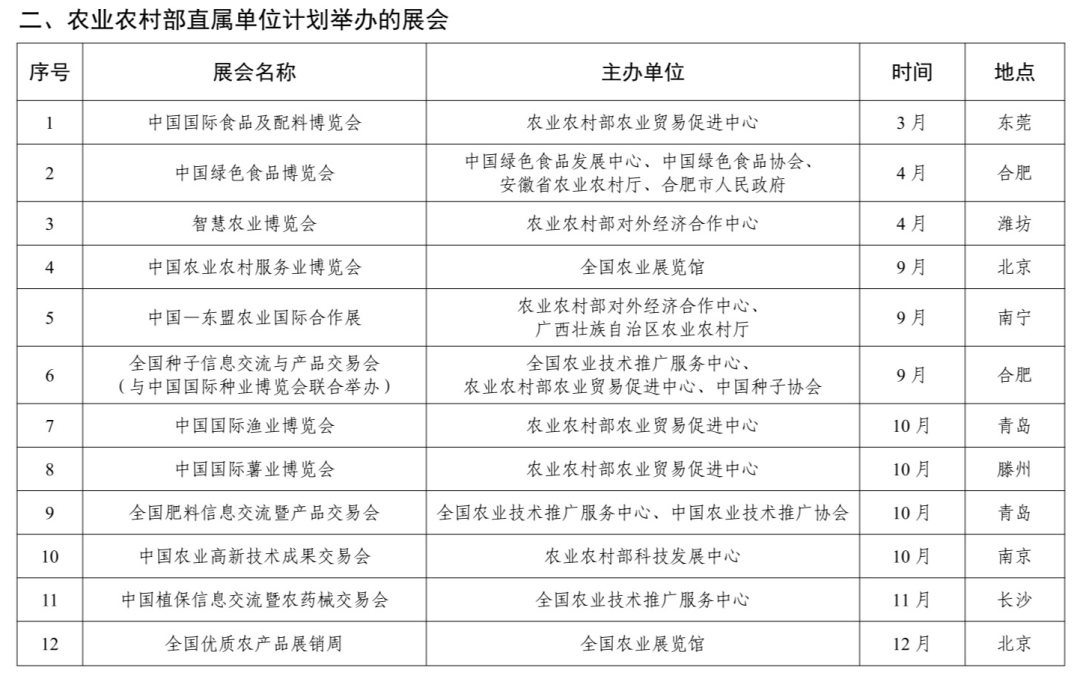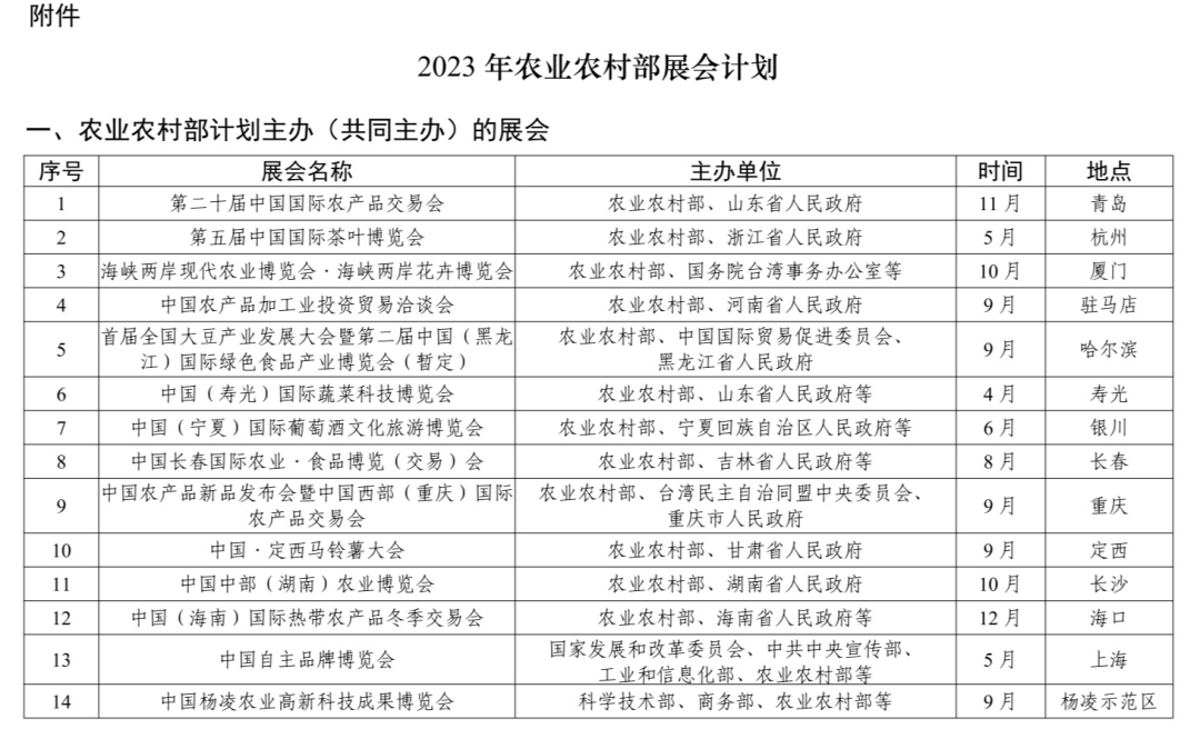 各省、自治区、直辖市农业农村(农牧)厅(局、委),新疆生产建设兵团农业农村局,部机关各司局、有关直属单位,有关单位: 《2023年农业农村部展会计划》已经农业农村部常务会议审议通过,现予印发,并将有关事宜通知如下。 一、加强组织领导。2023年是全面贯彻落实党的二十大精神的开局之年,也是加快建设农业强国的起步之年。要充分认识展会对全面推进乡村振兴、加快建设农业强国的重要作用,进一步强化组织领导,切实抓好农业农村成就展示、农业对外交流合作、农产品贸易发展等工作,确保取得实效。二、推动创新发展。统筹展会举办和产业发展,搭建高效对接平台,以市场为导向引领乡村产业高质量发展。要创新办展理念,优化运营机制,提高展览质量,做优展会服务,不断提升展会影响力和美誉度。要积极支持脱贫地区参展,支持打造区域公用品牌,并适当减免费用。三、严格展会管理。按照“谁主办,谁负责”的原则,明确责任主体,抓好关键环节,严格履行展会申报审批变更程序,严格落实展会期间举办的论坛类活动报批要求,推进展会规范化发展。要节约务实办展,严格遵守财经纪律,加强监督管理,严防违纪违规行为发生,不得随意转嫁有关费用。要落实农产品质量安全追溯与农业展会挂钩要求,严把产品审核关,确保参展产品质量。四、加强经验总结。认真做好展会报备和总结工作,研究总结好创新办展、专业运营等方面的经验做法,在展会结束后1个月内将总结报告(包括纸质版和电子版)报送至农业农村部市场与信息化司和业务归口司局。 联 系 人:农业农村部市场与信息化司 郭瑶 刘福江 联系电话:010-59192156/3279,010-59192101(传真)