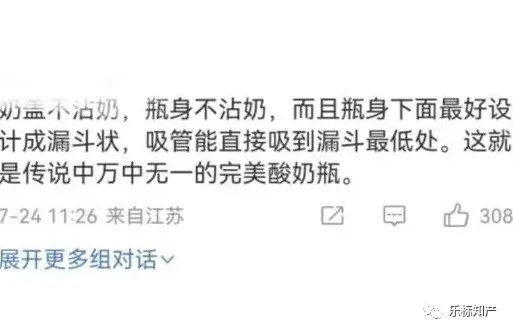 更有网友建议:“盖子可以沾奶,但瓶身粘得真的受不了,最好再开发一个不沾奶的酸奶瓶。”还有网友补充,将酸奶瓶做成漏斗状:“奶盖不沾奶,瓶身不沾奶,而且瓶身下面最好设计成漏斗状,吸管能直接吸到漏斗最低处。这就是传说中万中无一的完美酸奶瓶。”尽管网友评价各异,但“不沾奶”酸奶盖仍受到了市场的欢迎啊!