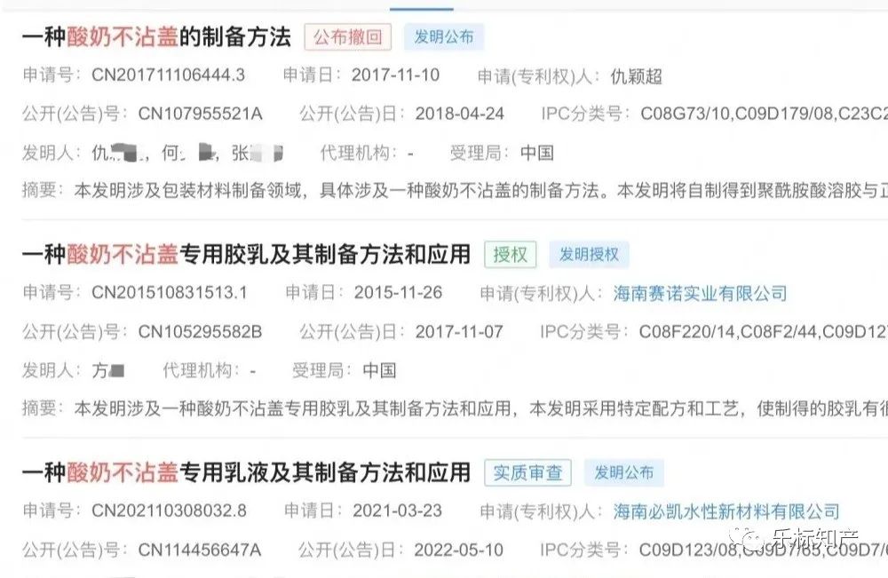 企查查APP显示,多人曾申请酸奶不沾盖专利,包括“一种酸奶不沾盖的制备方法”、“一种酸奶不沾盖专用乳液及其制备方法和应用”等,其中“一种酸奶不沾盖专用胶乳及其制备方法和应用”专利已获授权,其摘要显示,本发明采用特定配方和工艺,使制得的胶乳有很好的阻隔性能,延长了酸奶的保质期,而且具有良好的防水性能,解决了酸奶容易沾粘酸奶盖的问题,且胶乳粒径分布均匀、稳定性好,可达到常温下存放2年不破乳、无沉淀,安全性好、环保、能广泛运用于酸奶包装行业。