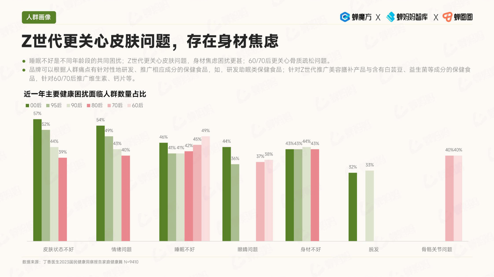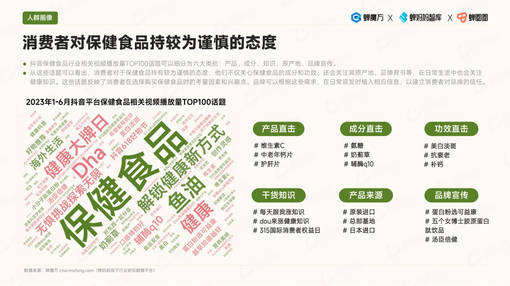 在消费人群画像方面,银发人群的消费意愿不断提升。与此同时,男性对保健食品的关注度也有所增加,他们更加注重运动补充方面的需求。女性则更关注美容瘦身领域。值得注意的是,Z世代具有潜在的高需求,他们对保健食品充满兴趣。