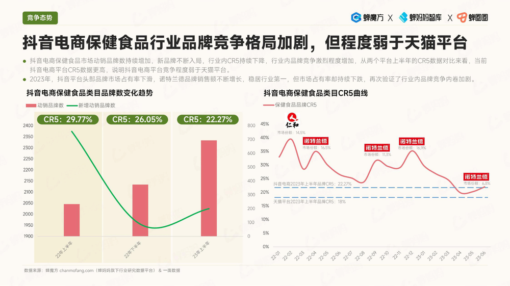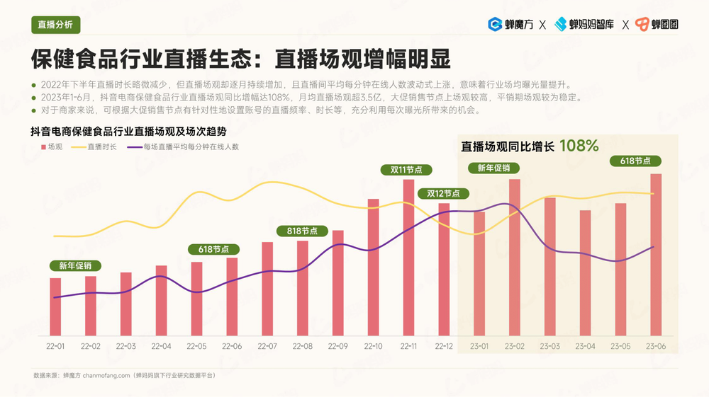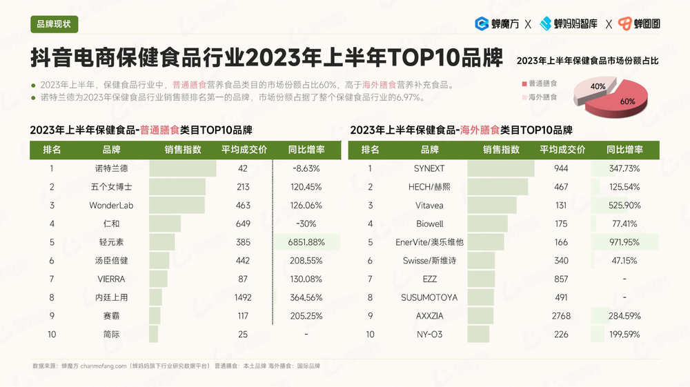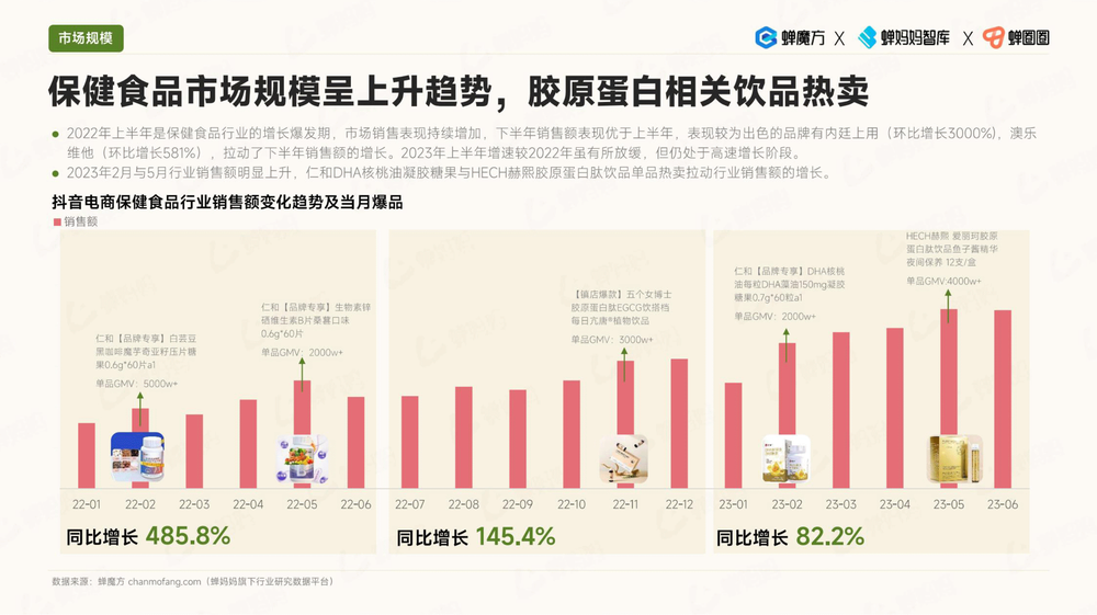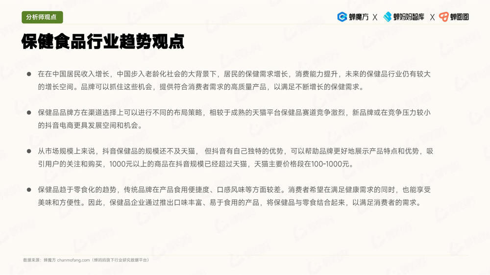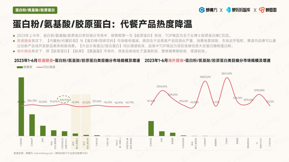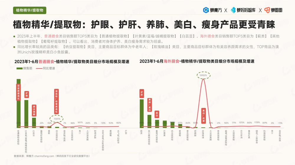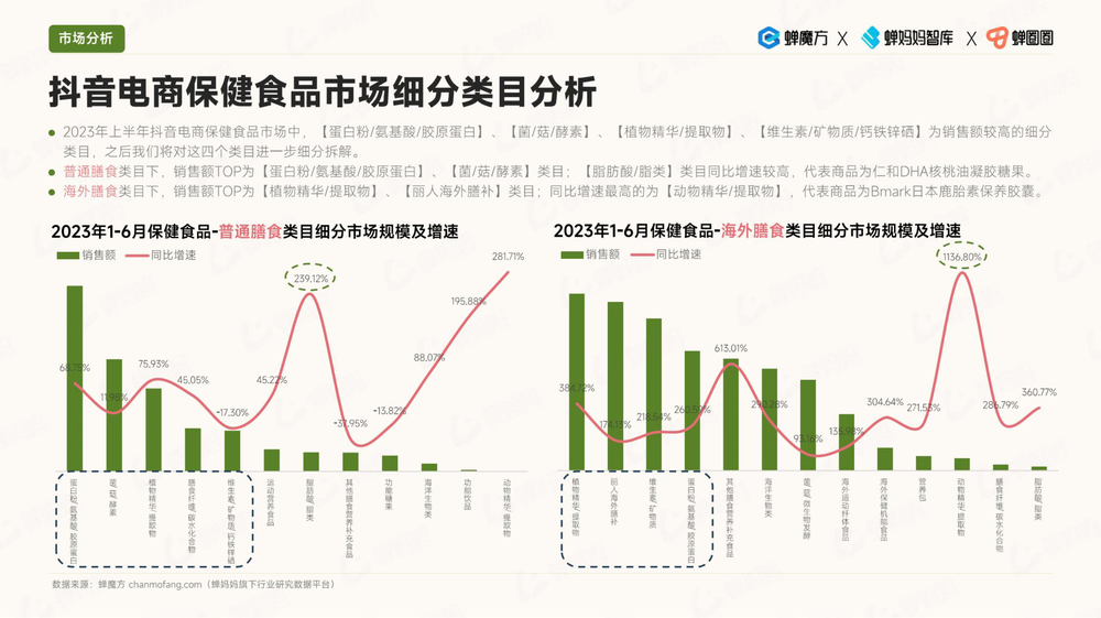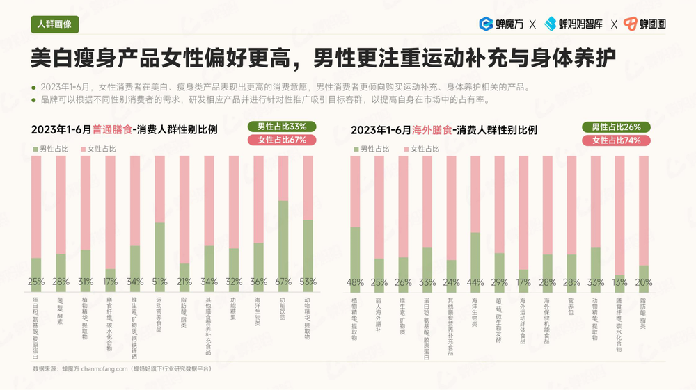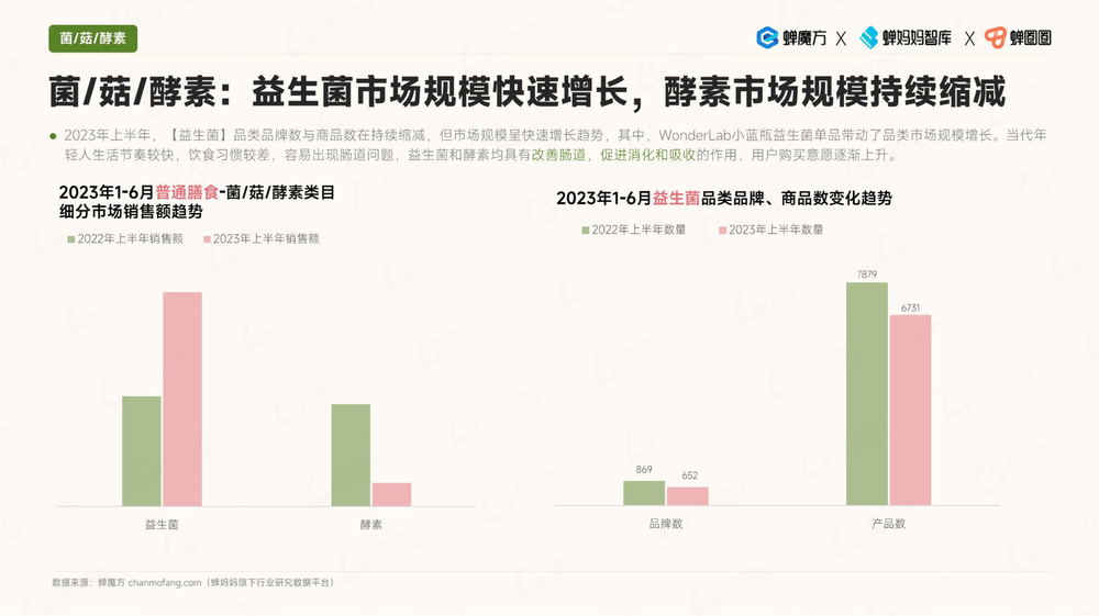 其次,细分品类的趋势显示,代餐食品的热度有所降温,而益生菌市场规模快速增长。此外,孕妇和备孕期消费者对保健食品的需求也在上升,美容膳补市场的增速也相当可观。