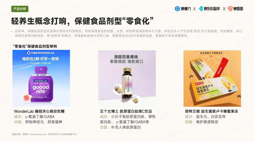 报告显示,消费者对保健食品的需求不断增长,市场竞争格局也在加剧。为了满足消费者多样化的需求,传统保健食品品牌开始创新,将产品剂型趋向更加方便的“零食化”。