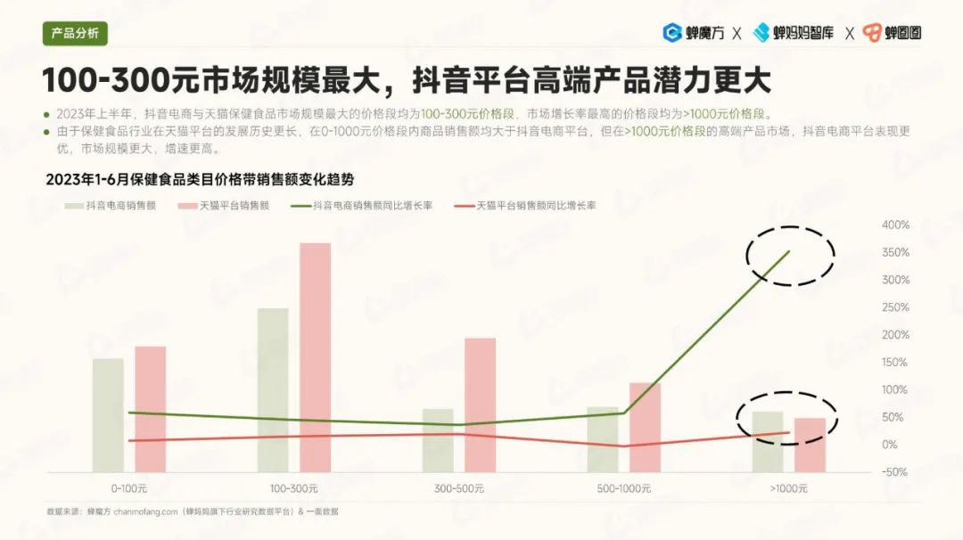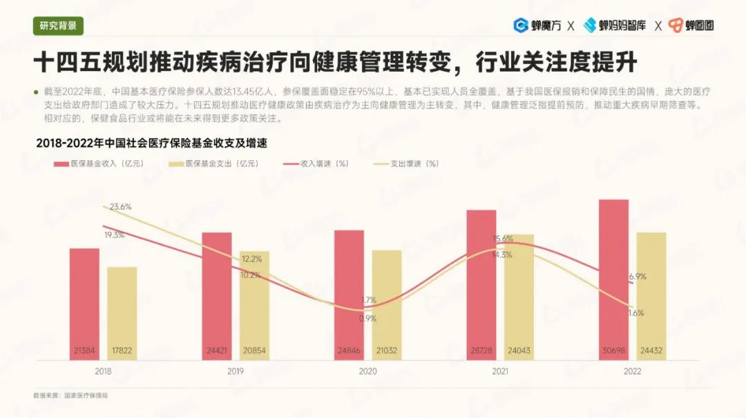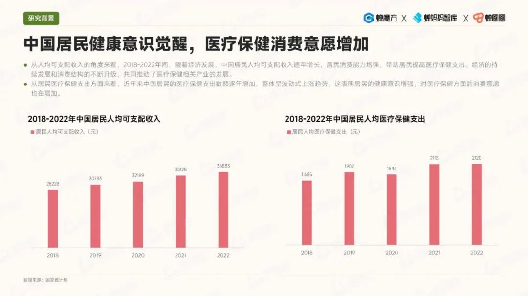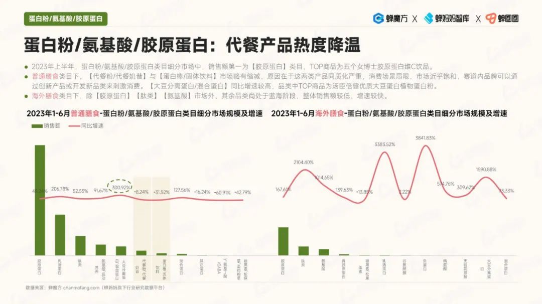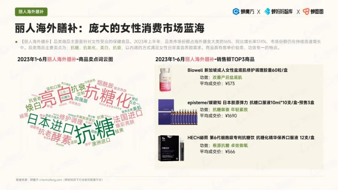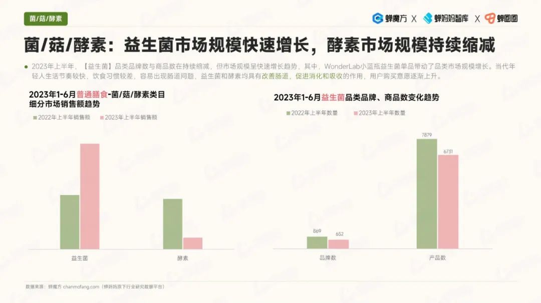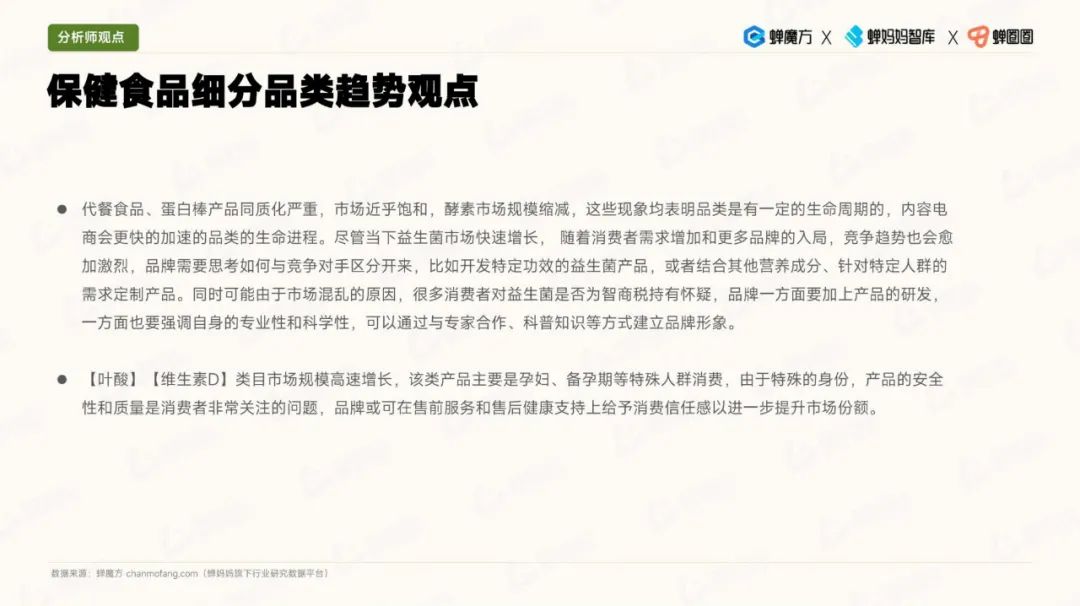 其次,细分品类的趋势显示,代餐食品的热度有所降温,而益生菌市场规模快速增长。此外,孕妇和备孕期消费者对保健食品的需求也在上升,美容膳补市场的增速也相当可观。
