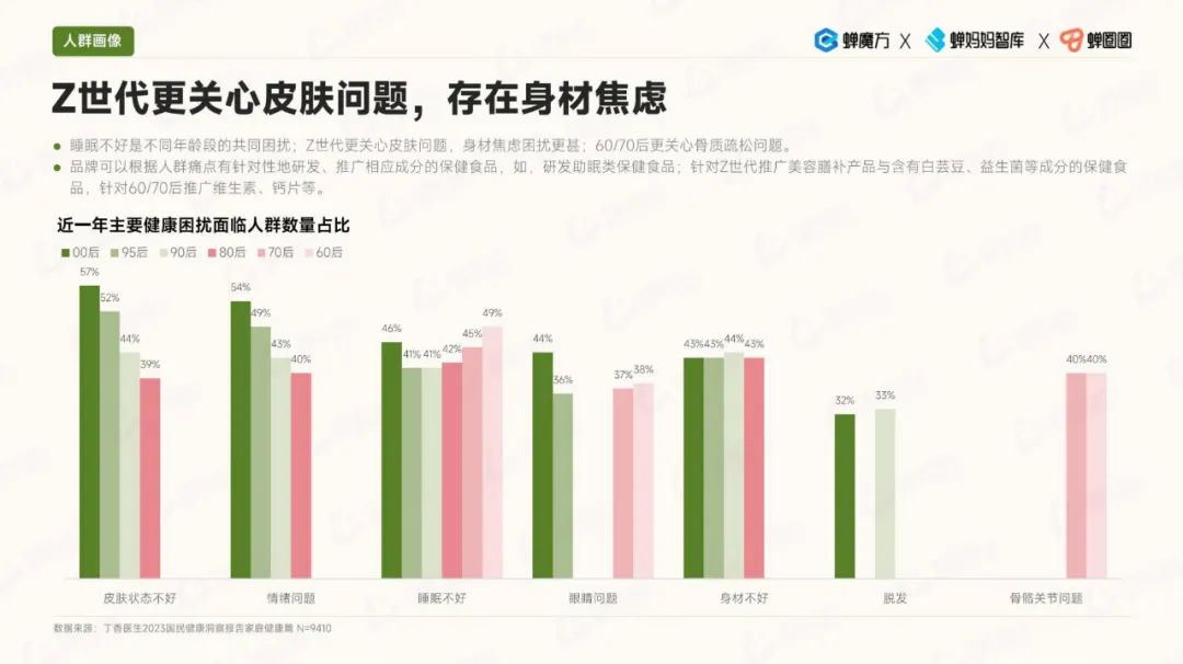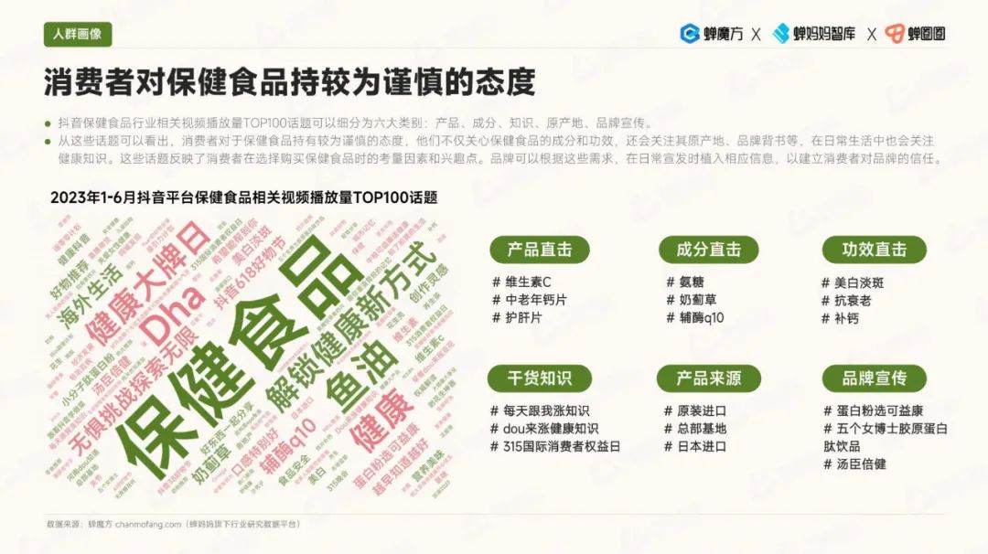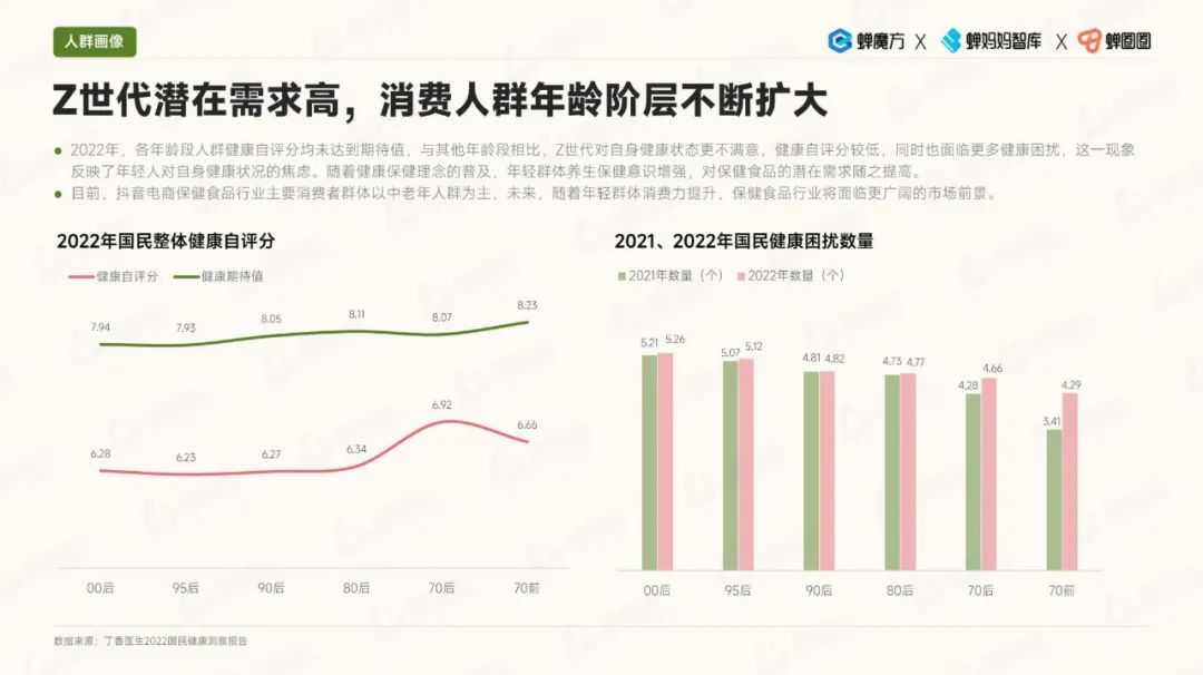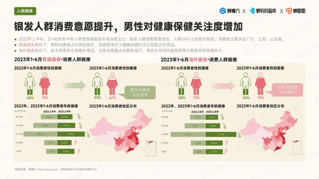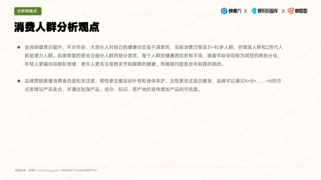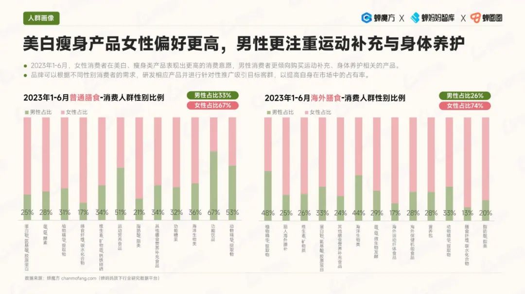 在消费人群画像方面,银发人群的消费意愿不断提升。与此同时,男性对保健食品的关注度也有所增加,他们更加注重运动补充方面的需求。女性则更关注美容瘦身领域。值得注意的是,Z世代具有潜在的高需求,他们对保健食品充满兴趣。