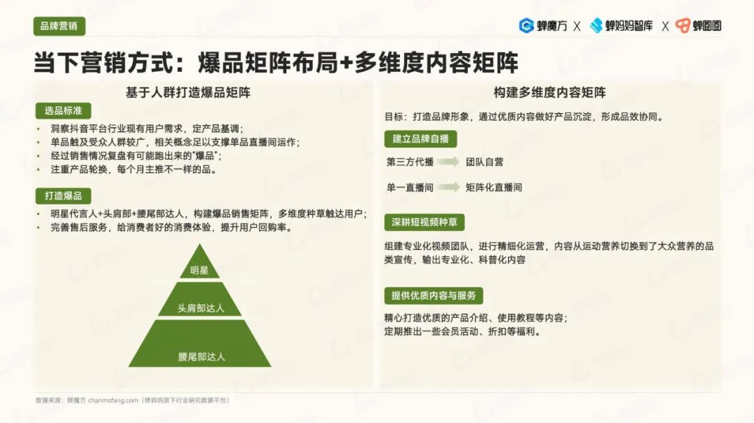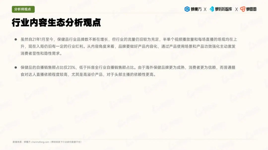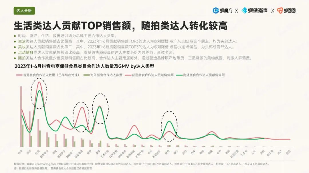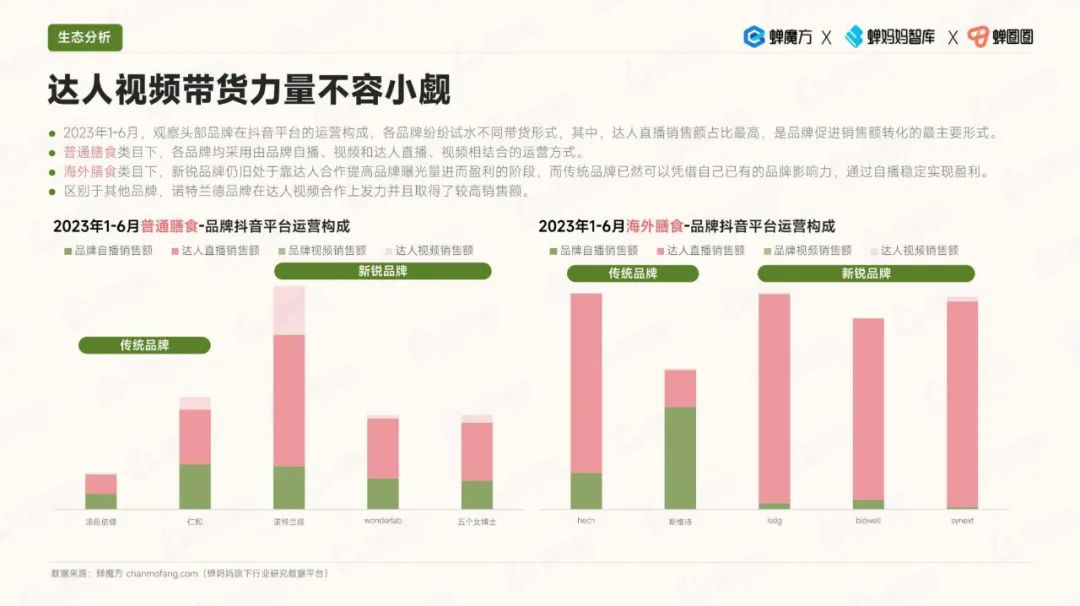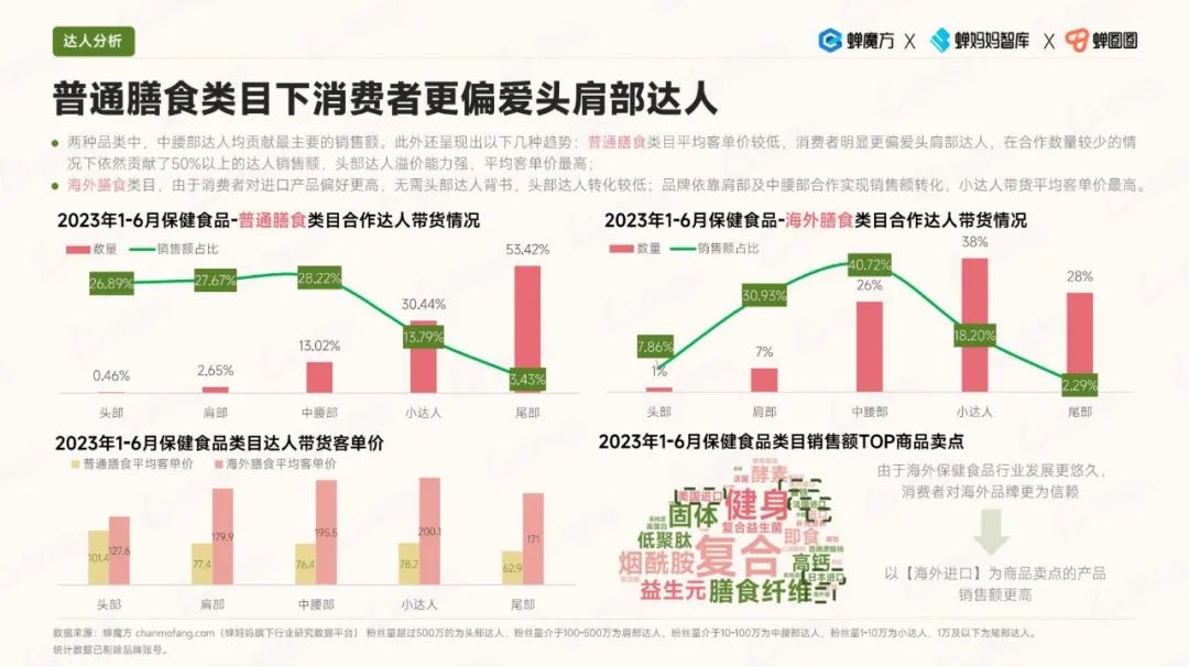 在内容生态方面,视频带货方式开始发力成为关键。消费者更倾向于选择头部达人在普通膳食类目下进行推荐,而生活类达人在内容贡献方面最受欢迎。同时,随拍类达人的转化率也较高,这为品牌合作和产品推广提供了机遇。