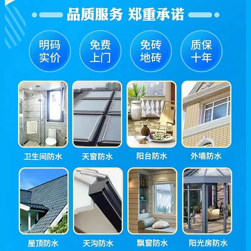 全市均可免费上门勘察报价,不收任何上门费。 我们是一家正规、专业、高效的防水补漏服务公司,承接单位、个人、建筑公司、小区物业、厂房、学校、酒店、宾馆、饭店、居民住户等各种新旧建筑防水补漏堵漏维修施工。