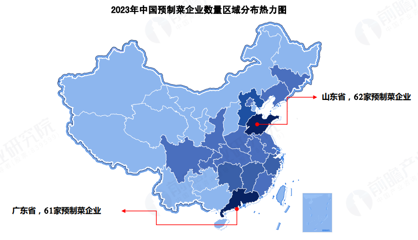 截至2023年2月16日,中国预制菜产业企业数量约301个,山东省和广东省的预制菜产业企业数量相对较多,在两地注册的预制菜产业企业分别有62家和61家。从中国预制菜区域企业数量分布情况来看,中国预制菜产业发展较为集中,行业竞争也在部分地区相对激烈。