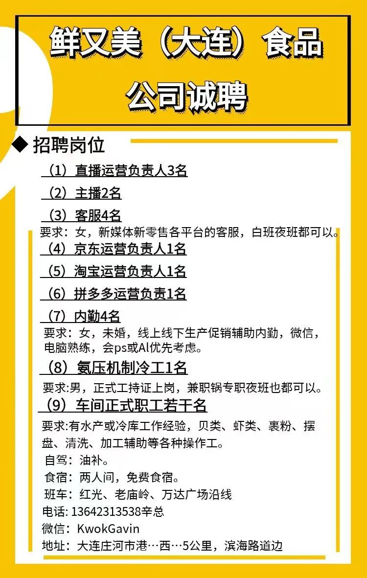 要求:有水产或冷库工作经验,贝类、虾类、裹粉、摆盘、清洗、加工辅助等各种操作工。