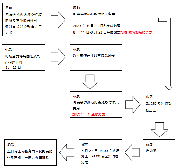 特装参展商务必于 8 月 10 日前,向主场服务商申报搭建方案并完成相应缴费,8 月 11 日至 8 月 22 日申报搭建方 案并完成缴费的,加收 30%延期服务费,现场办理搭建方案及缴费加收延期服务费 60%
