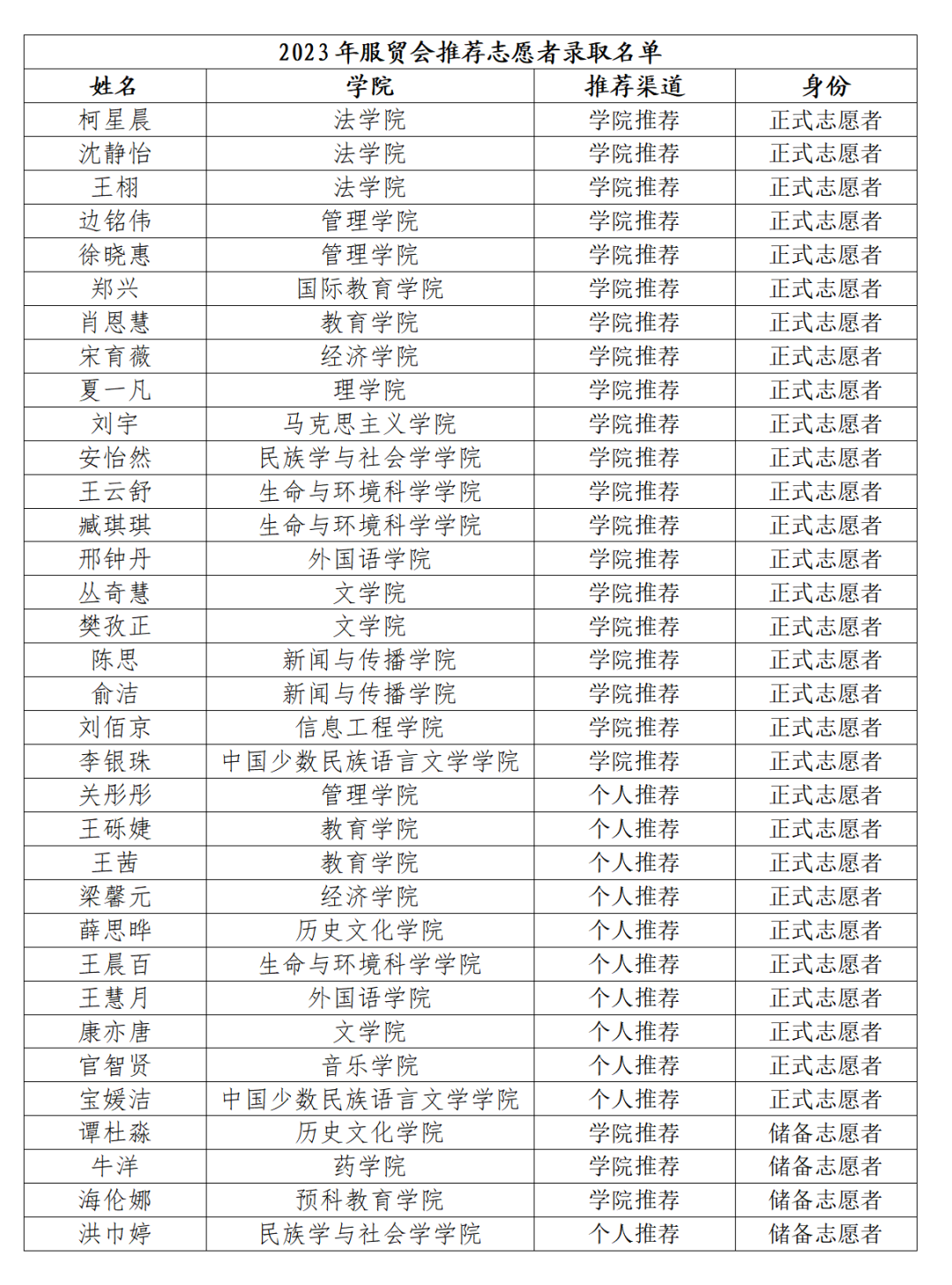 志愿者入选名单