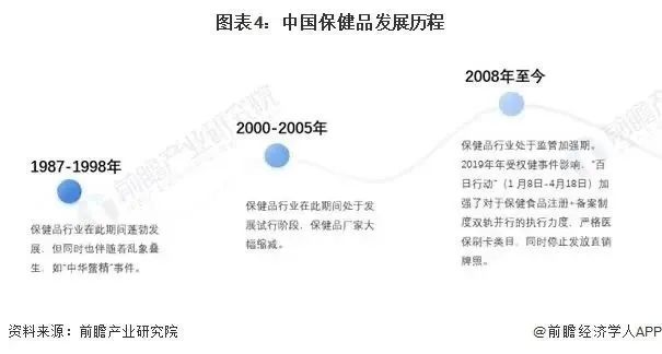 第一阶段为1987-1998年,保健食品行业在此期间蓬勃发展,但同时也伴随着乱象叠生,如“中华鳖精”事件;第二阶段为2000-2005年,保健食品行业在此期间处于发展试行阶段,保健品厂家大幅缩减;第三阶段为2008年至今,保健食品行业处于监管加强期。2019年年受权健事件影响,“百日行动”(1月8日-4月18日)加强了对于保健食品注册+备案制度双轨并行的执行力度,严格医保刷卡类目,同时停止发放直销牌照。