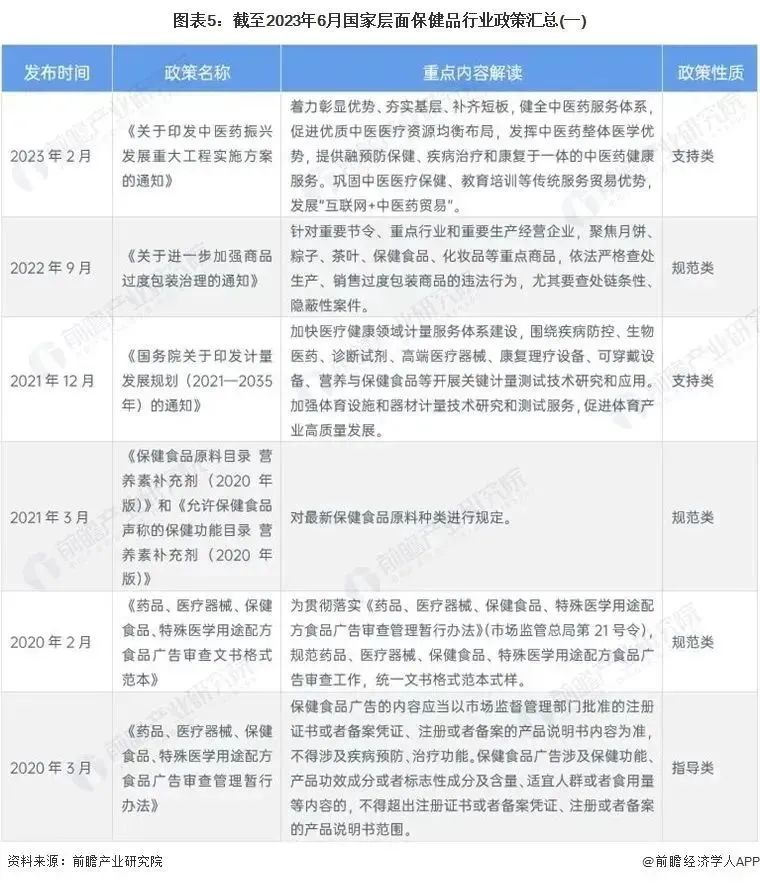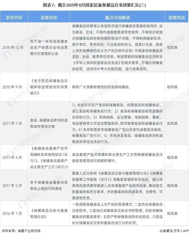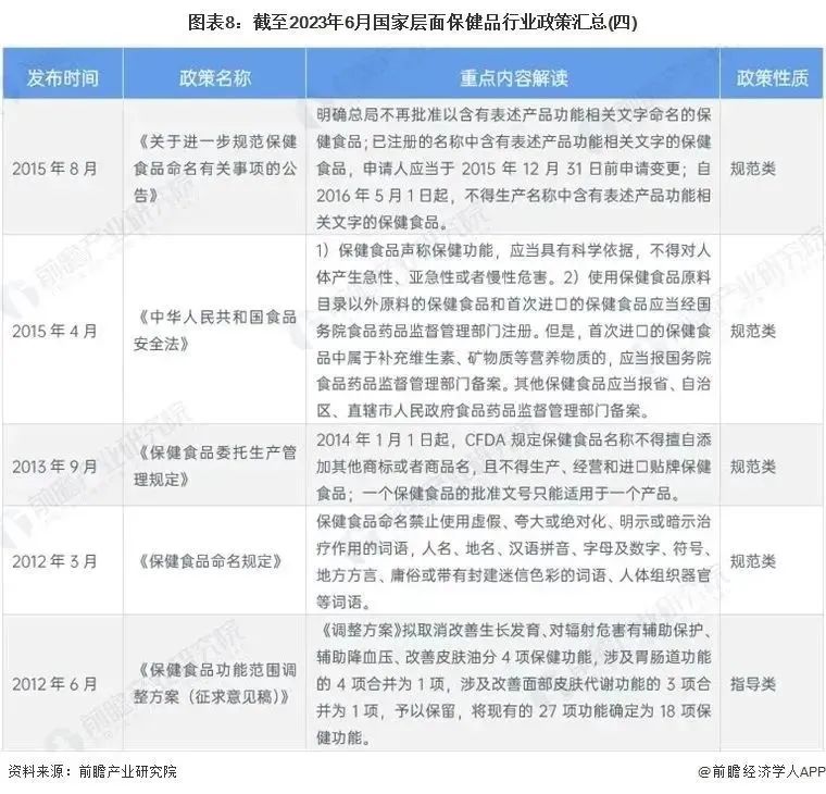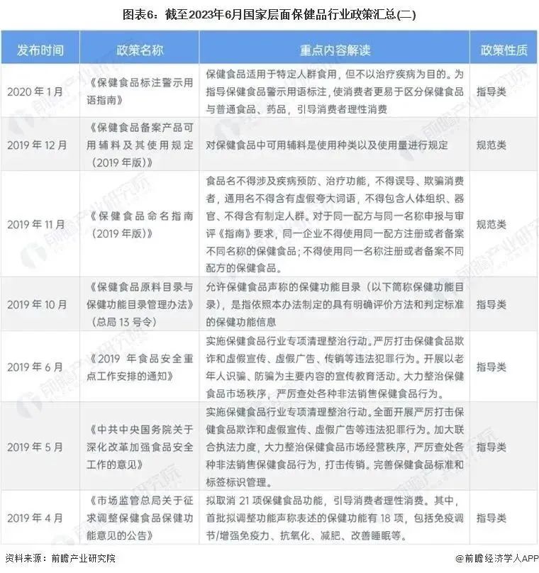 自2012年以来,国家市场监督管理总局、食品药品监管局、国家卫生健康委员会等多部门都陆续印发了支持、指导和规范保健品的发展政策,涉及保健食品命名和宣传规范、保健食品安全等内容,以规范类和指导类政策为主。截至2023年6月国家层面保健食品行业政策汇总如下: