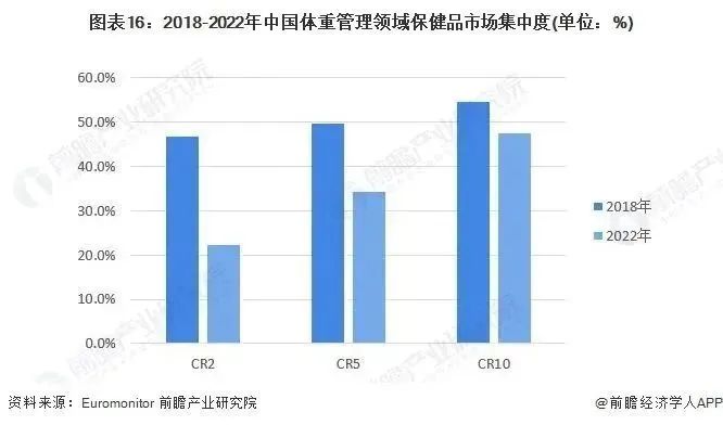从体重管理领域市场的集中度来看,2018-2022年,行业市场集中度整体呈现下降趋势,2018年,体重管理领域排名第一的康宝莱市场份额高达43%;2022年下降至约为14%,反映新企业进入壁垒不高,市场龙头效应下降。2022年,CR5下降至40%以下、CR10下降至50%以下。整体来看,中国体重管理领域保健品市场集中度下降,市场竞争加剧。