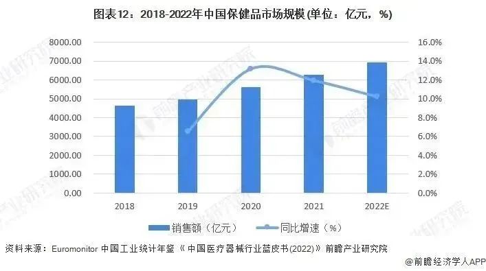 中国保健食品市场主要包括保健食品、保健药品和保健用品,从市场规模数据来看,2018-2022年中国保健食品市场的市场规模呈现逐年上升的趋势,2021年市场规模达到6272亿元,同比增长12%;初步统计,2022年,中国保健食品市场规模超过6900亿元。