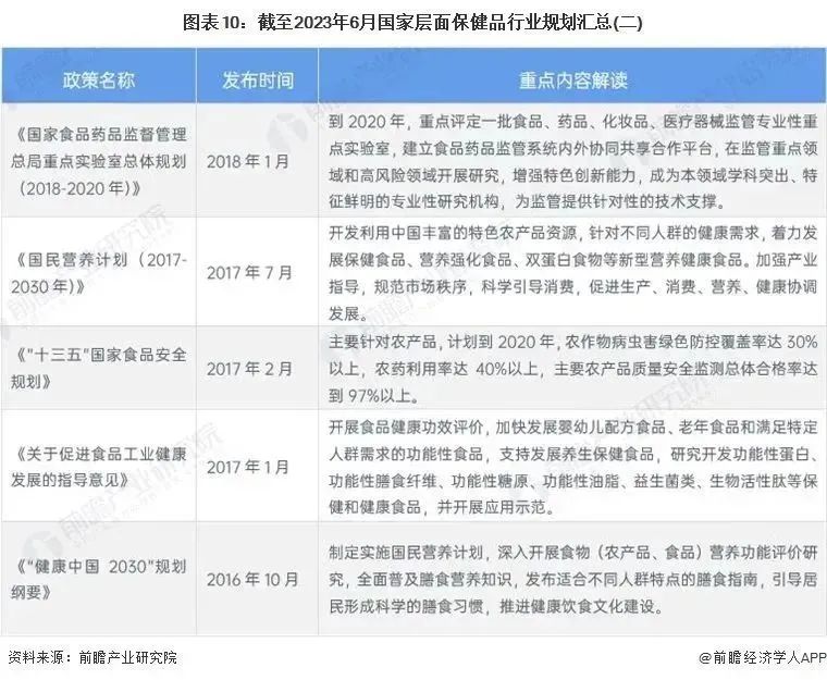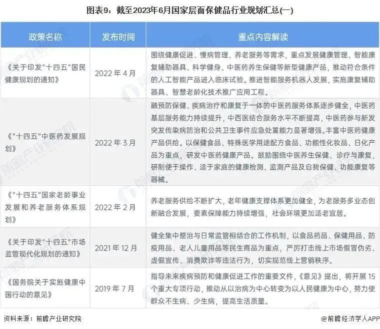 为促进居民健康,强化老年预防保健,国家各部门提出系列政策规划促进保健食品行业规范发展。在《“十四五”国民健康规划》中提出围绕健康促进、慢病管理、养老服务等需求,重点发展健康管理、智能康复辅助器具、科学健身、中医药养生保健等新型健康产品。国家层面保健食品行业规划汇总如下表所示: