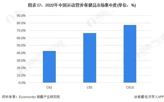 从运动营养领域市场的集中度来看,2022年市场份额占比排名前二的企业市场份额超过40%;其中,排名第一的是西王食品,市场份额超过30%,龙头效应明显;CR10超过75%,总体来说市场集中度较高。
