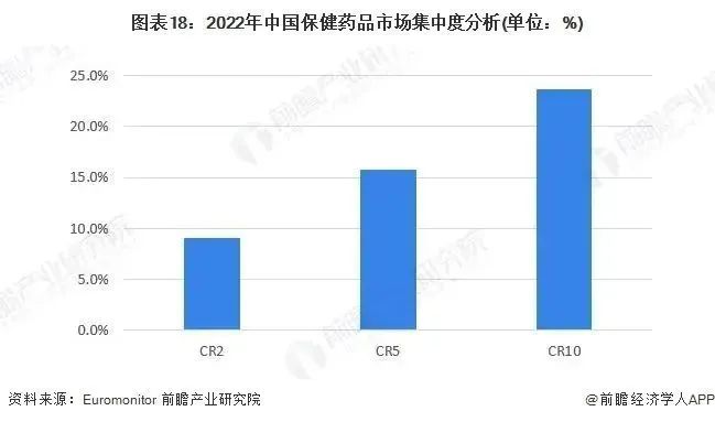 从保健药品的集中度来看,2022年市场份额占比排名前二的企业市场份额为9%,其中排名第一的无极限市场份额约为5.5%。排名前五的企业市场份额集中度约为16%,排名前十的企业市场集中度约为24%。整体来看,中国保健药品市场集中度不高,市场竞争比较激烈。