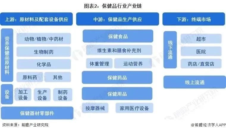保健食品产业链上游主要包括保健食品原材料(动物/植物/中药材、生物制剂、化学药品等)、配套设备和保健器材零部件;中游是指保健食品供应商,保健食品种类繁多,市场上常见的可划分为保健食品及药品、保健器械,保健食品又主要包括传统滋补类和膳食补充剂;产业链下游主要为保健食品的流通企业,主要包括各大超市、医院、药店、直营店和电商等。
