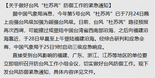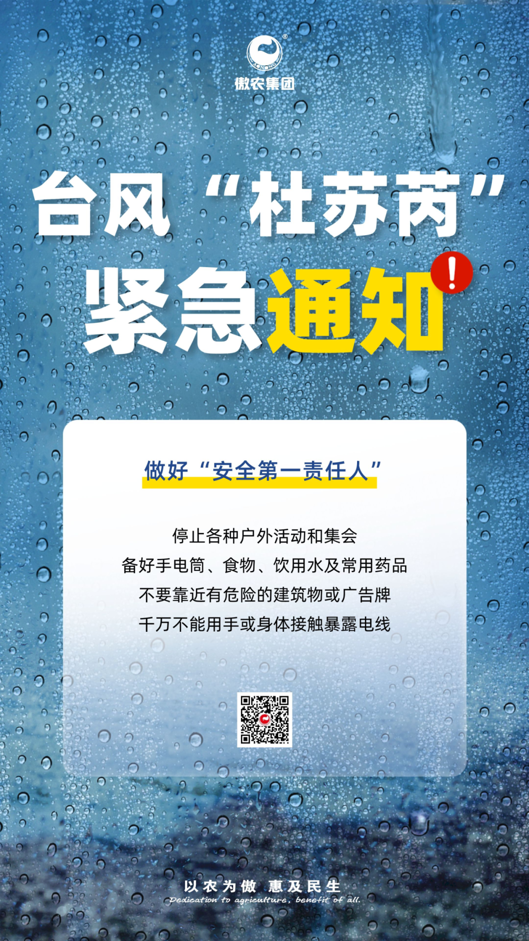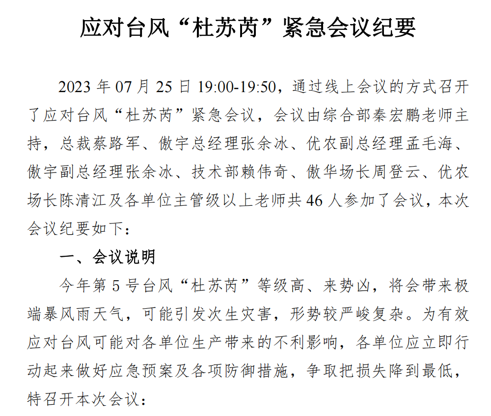 为防抗台风杜绝隐患,确保员工生命安全,傲农集团高度重视,于7月25日和7月27日上午,两度发布紧急通知,全面部署台风“杜苏芮”防御工作。通知中强调,各相关生产单位要高度重视,落实责任;加强监测,预报预警;加强风险隐患排查整治;做好应急抢险救援工作准备。