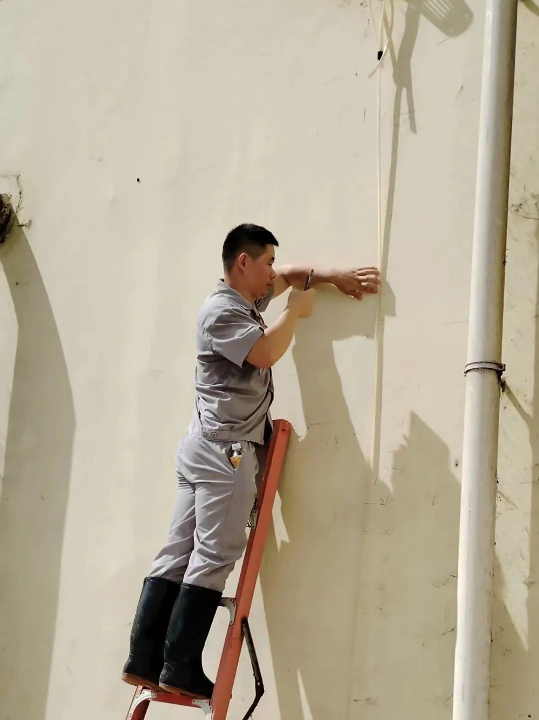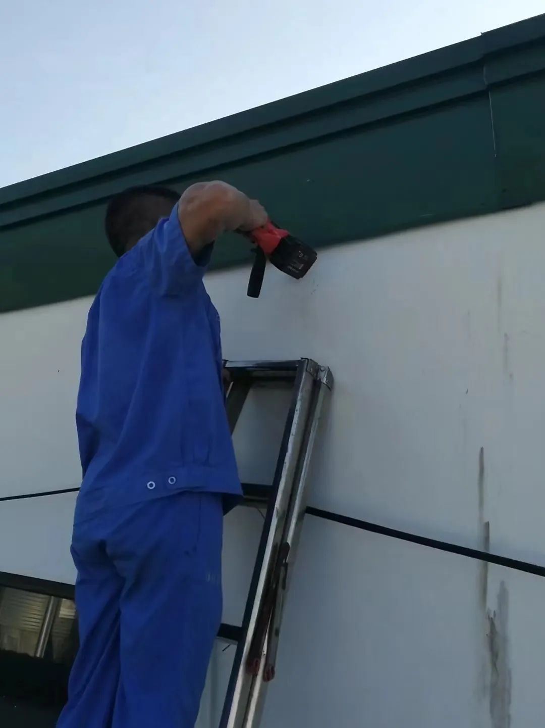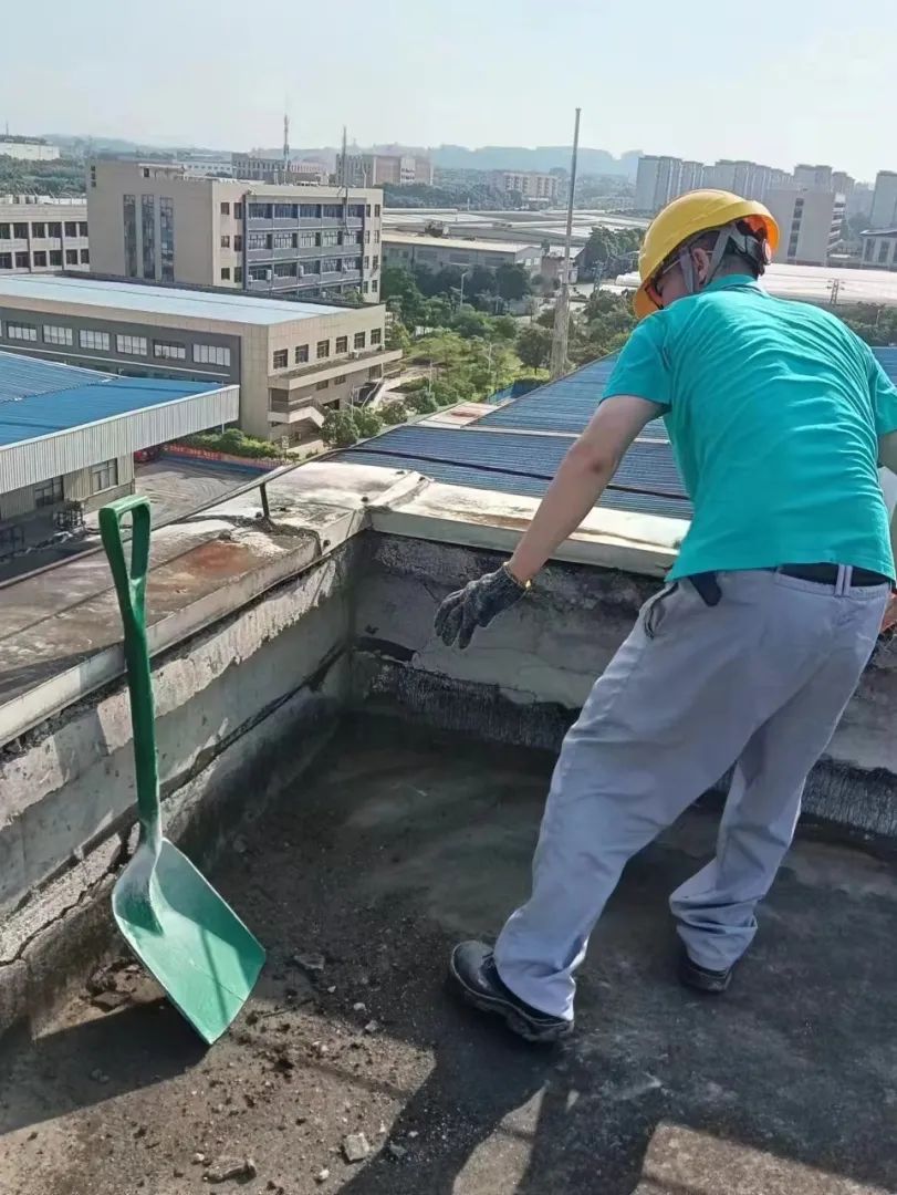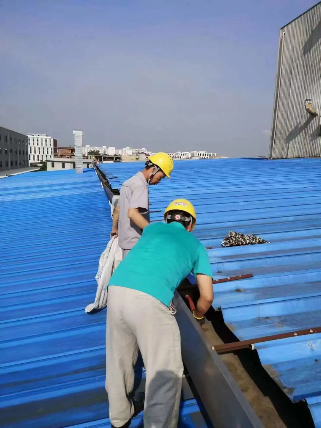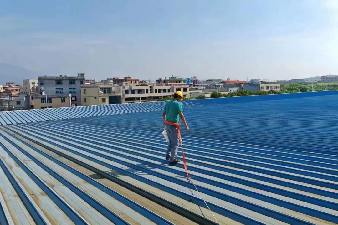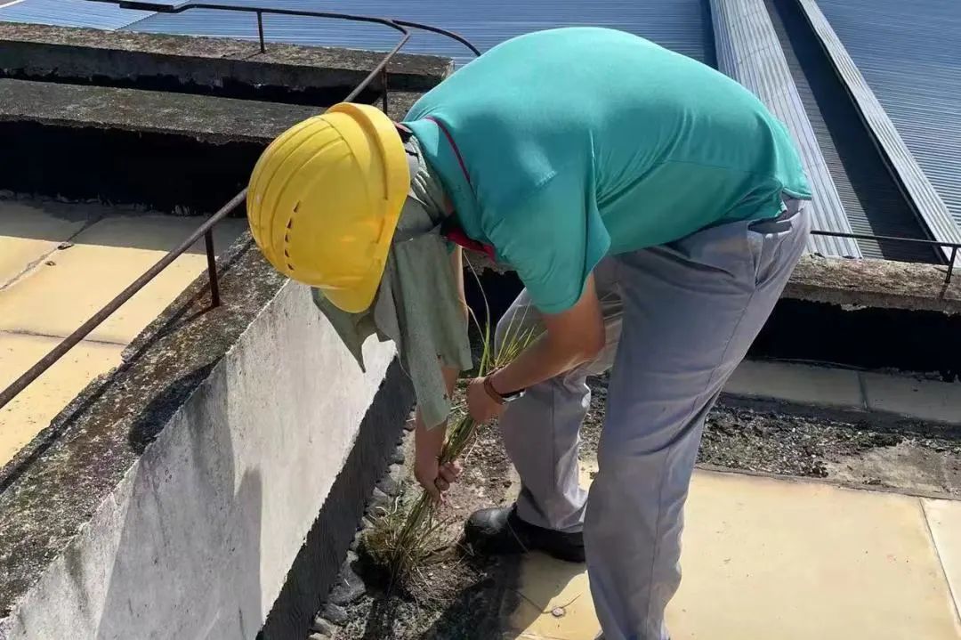 员工佩戴安全绳登上屋顶,对车间屋顶连接处做进一步加固,同时对屋顶杂草杂物等进行清理。