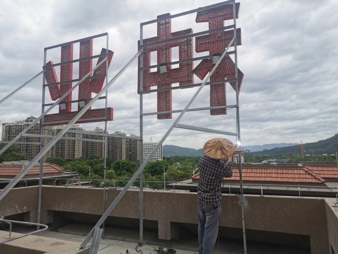 傲芯种业对楼顶发光字进行加固,防止台风天气高层掉落。