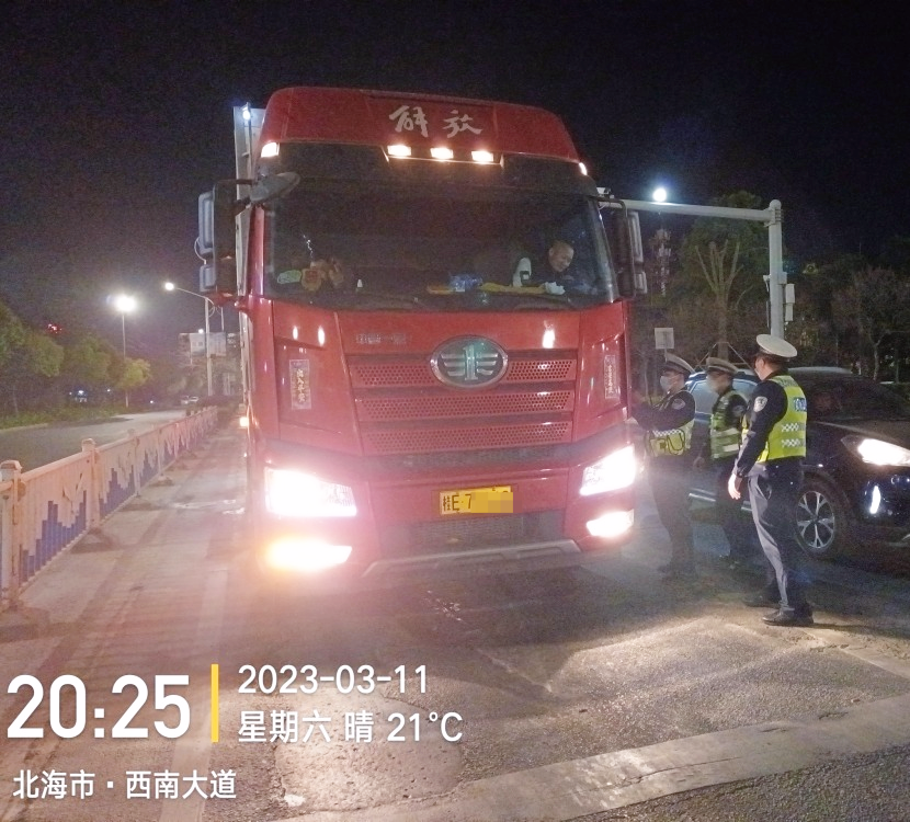 为全力维护全市道路交通安全形势稳定,做好辖区道路交通事故预防工作,北海公安交警组织警力开展周末道路交通违法集中整治行动,重点围绕与交通事故紧密相关联的违法行为,严查货车超速、超员、超载、疲劳驾驶“三超一疲劳”、强超强会、违法停车、违法占用应急车道、酒驾醉驾、摩托车驾驶人不戴安全头盔、摩托车电动自行车超员、货车违法载人等肇事肇祸易致死致伤交通违法行为。