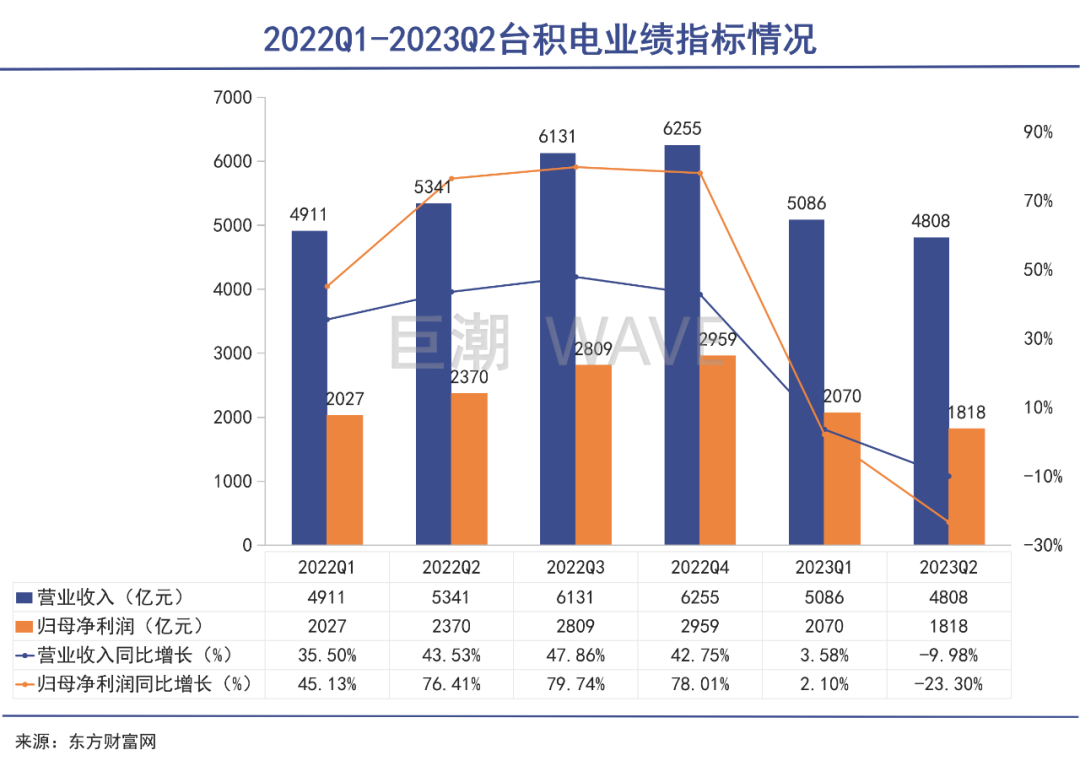 台积电公布的2023年第二季度财务报告显示,合并营收约新台币4808.4亿元,比去年同期下滑10%,比上一季度环比下滑5.5%;归母净利润为新台币1818亿元,比去年同期减少23.3%,比上一季度环比下滑12.2%。