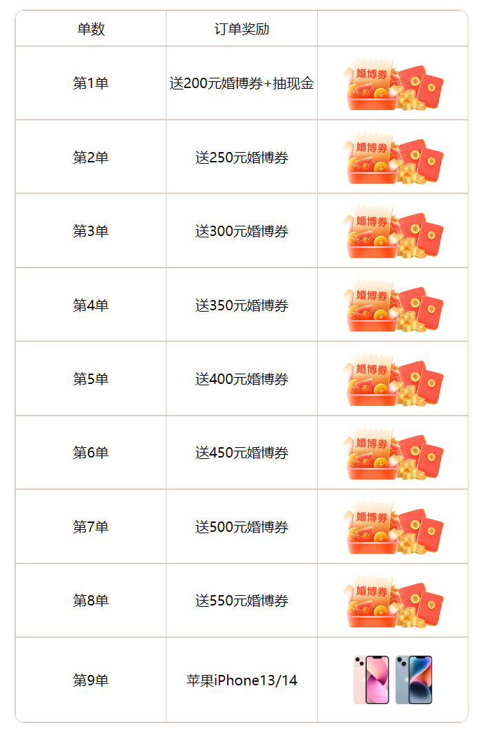 后续每录入一个不同类别的订单,就可以激活下一张更高面额的婚博券,在下一个订单时使用。
