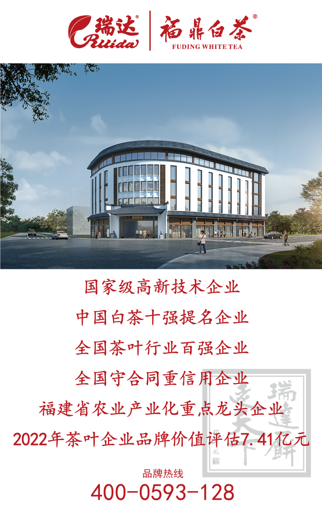 瑞达茶业创立至今,一直紧跟福鼎市委、市政府的宣传步伐,积极参加集体茶企展出机会,在世界各地的茶业展会上大放异彩,推广福鼎白茶文化;瑞达始终坚持“高品质,创品牌”的经营战略,践行“好白茶,源瑞达”的品牌理念,发扬与传承福鼎白茶传统制作技艺,匠心独运,致力于为消费者提供优质、天然、绿色的好白茶,让全国至世界更深刻地、更全面地了解福鼎白茶。